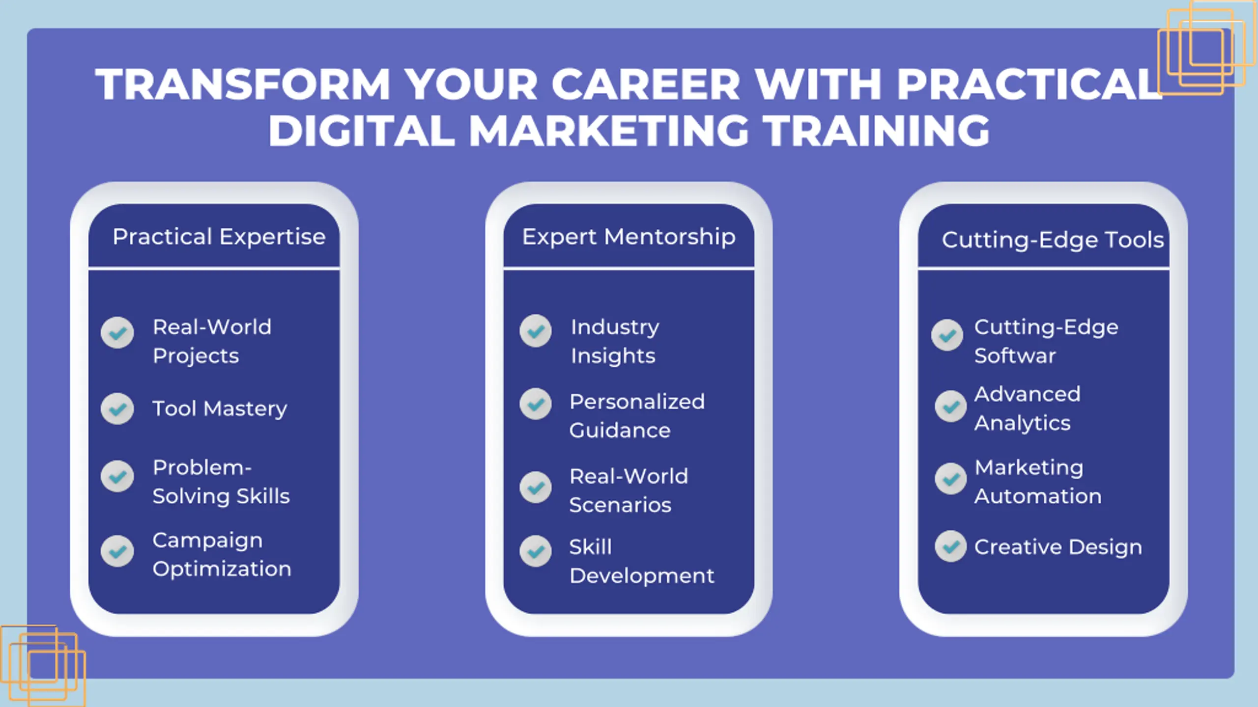 TRANSFORM YOUR CAREER WITH PRACTICAL DIGITAL MARKETING TRAINING Practical Expertise Expert Mentorship Cutting-Edge Tools Real-World Projects Industry Insights Cutting-Edge Softwar Advanced Analytics Personalized Guidance Tool Mastery Problem- Solving Skills Marketing Automation Real-World Scenarios Campaign Optimization Skill Development Creative Design