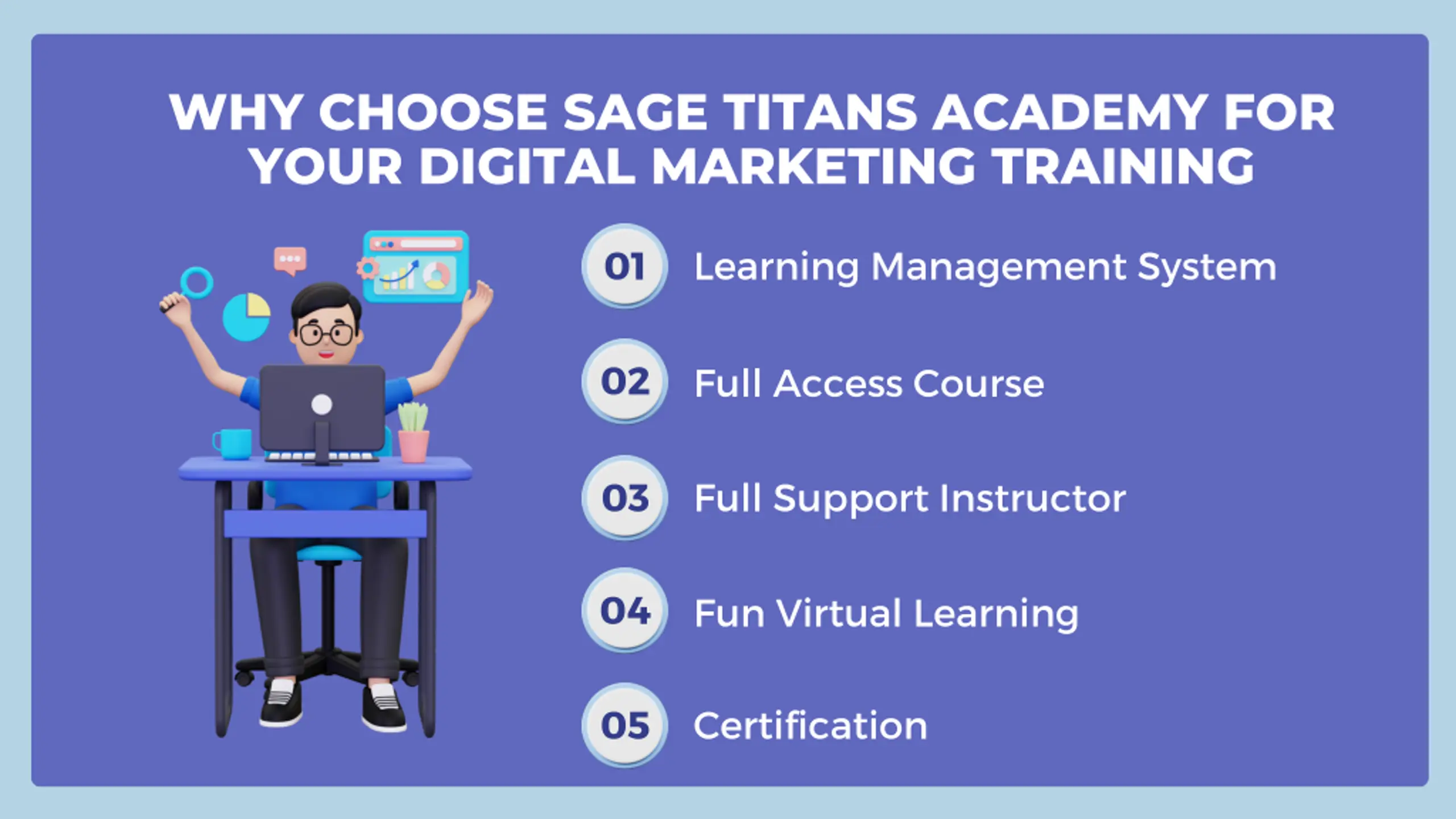 WHY CHOOSE SAGE TITANS ACADEMY FOR YOUR DIGITAL MARKETING TRAINING Learning Management System 01 02 Full Access Course 03 Full Support Instructor 04 Fun Virtual Learning Certification 05