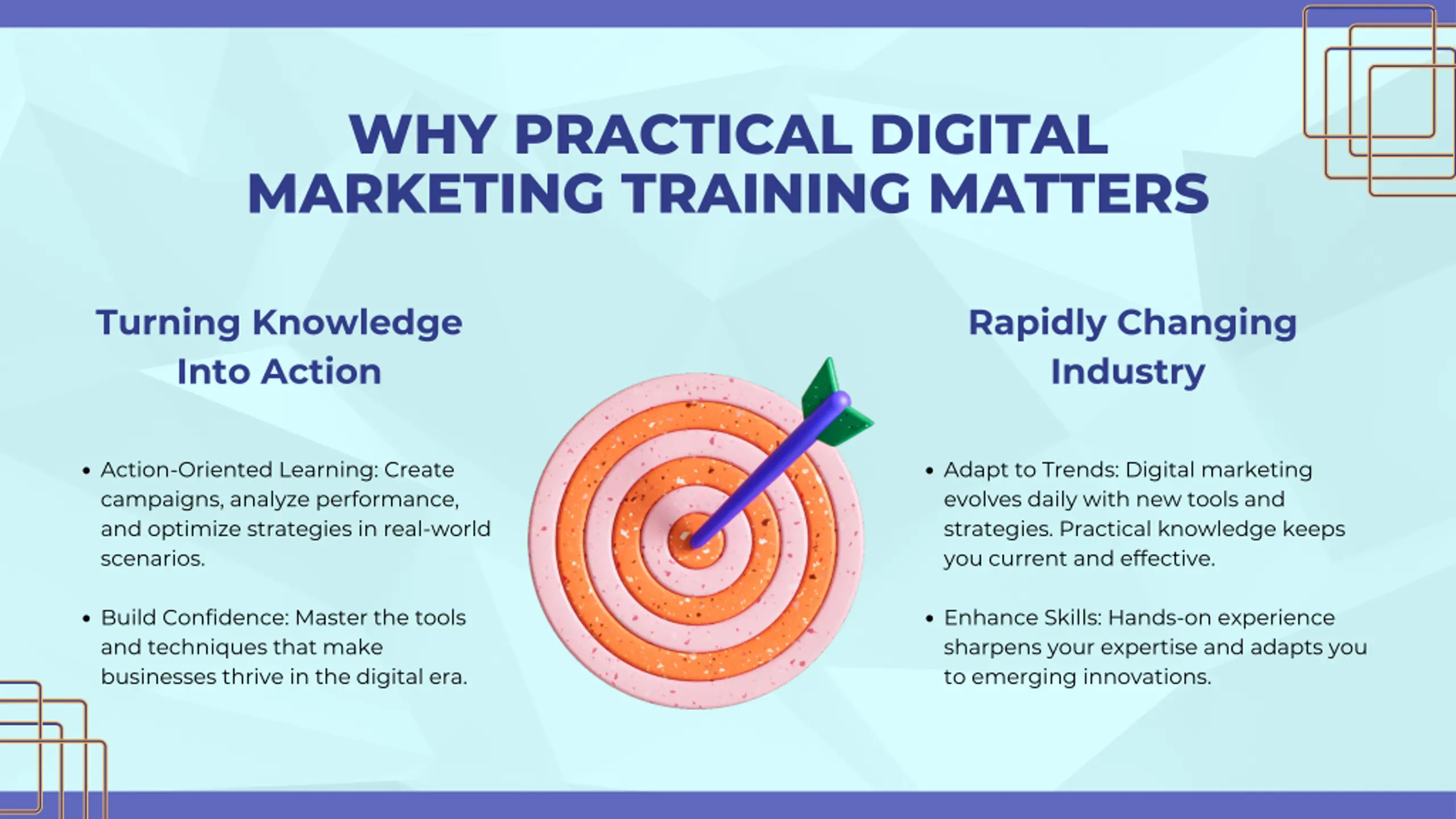 WHY PRACTICAL DIGITAL MARKETING TRAINING MATTERS Turning Knowledge Into Action Rapidly Changing Industry Action-Oriented Learning: Create campaigns, analyze performance, and optimize strategies in real-world scenarios. Adapt to Trends: Digital marketing evolves daily with new tools and strategies. Practical knowledge keeps you current and effective. Build Confidence: Master the tools and techniques that make businesses thrive in the digital era. Enhance Skills: Hands-on experience sharpens your expertise and adapts you to emerging innovations.