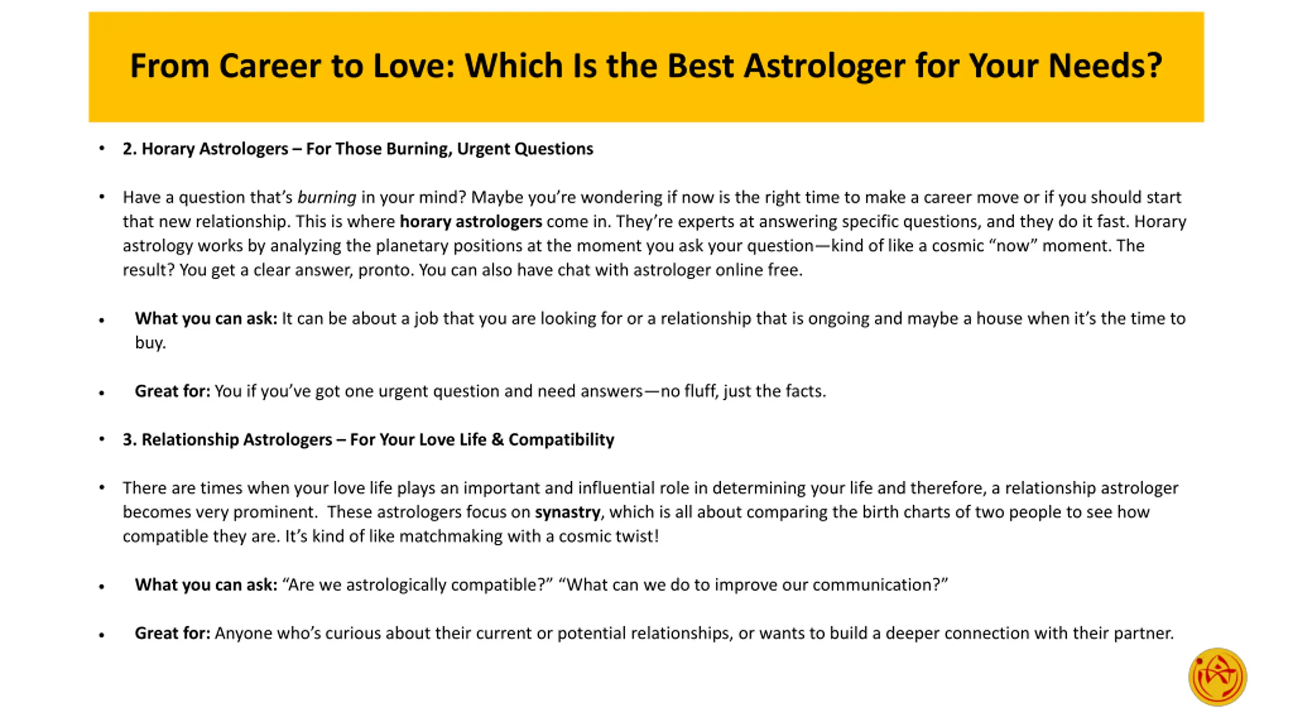 From Career to Love: Which Is the Best Astrologer for Your Needs? 2. Horary Astrologers For Those Burning, Urgent Questions Have a question that s burning in your mind? Maybe you re wondering if now is the right time to make a career move or if you should start that new relationship. This is where horary astrologers come in. They re experts at answering specific questions, and they do it fast. Horary astrology works by analyzing the planetary positions at the moment you ask your question kind of like a cosmic now moment. The result? You get a clear answer, pronto. You can also have chat with astrologer online free. What you can ask: It can be about a job that you are looking for or a relationship that is ongoing and maybe a house when it s the time to buy. Great for: You if you ve got one urgent question and need answers no fluff, just the facts. 3. Relationship Astrologers For Your Love Life & Compatibility There are times when your love life plays an important and influential role in determining your life and therefore, a relationship astrologer becomes very prominent. These astrologers focus on synastry, which is all about comparing the birth charts of two people to see how compatible they are. It s kind of like matchmaking with a cosmic twist! What you can ask: Are we astrologically compatible? What can we do to improve our communication? Great for: Anyone who s curious about their current or potential relationships, or wants to build a deeper connection with their partner.