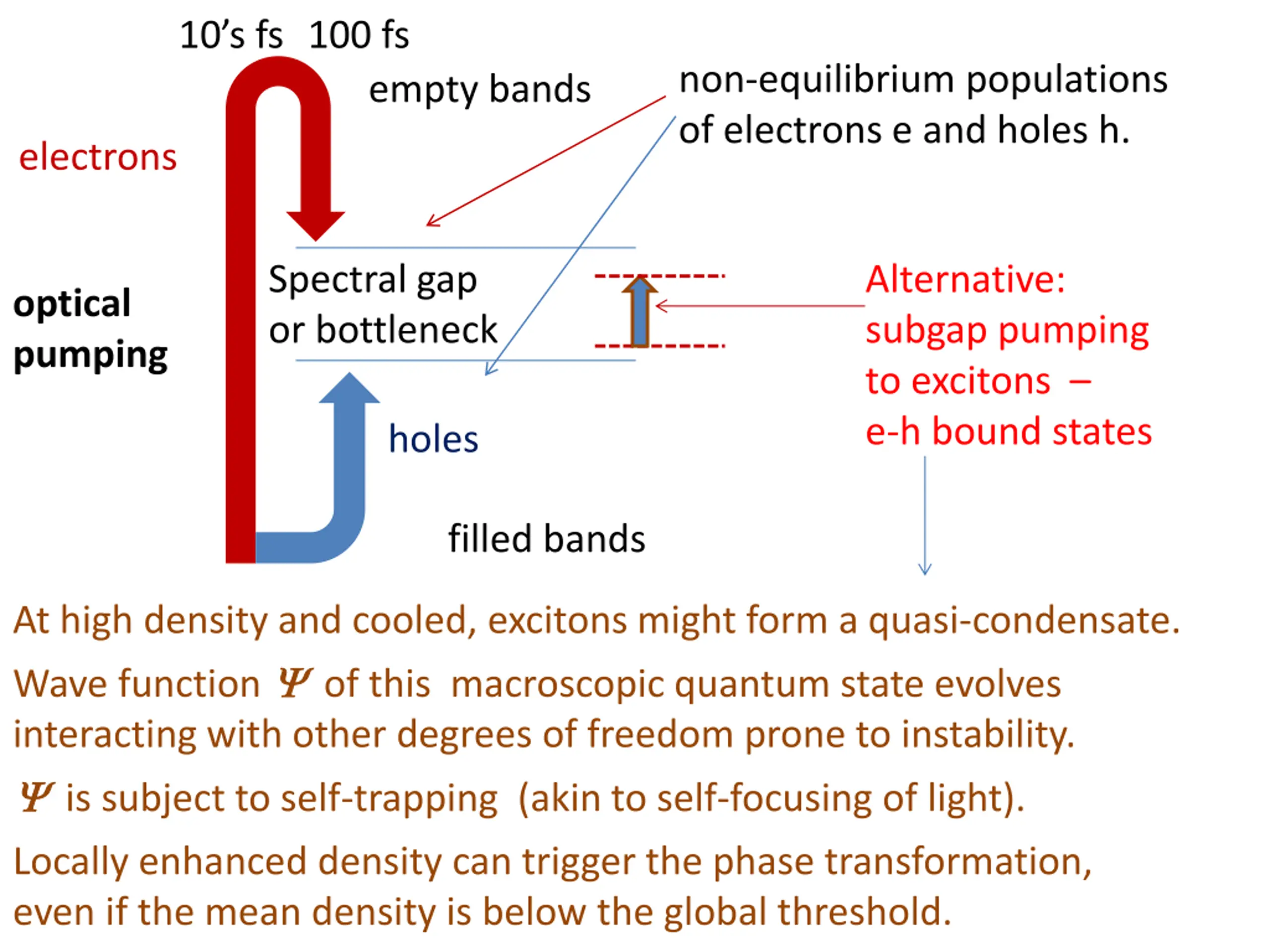 10s fs 100 fs non-equilibrium populations of electrons e and holes h. empty bands electrons Spectral gap or bottleneck Alternative: subgap pumping to excitons e-h bound states optical pumping holes filled bands At high density and cooled, excitons might form a quasi-condensate. Wave function of this macroscopic quantum state evolves interacting with other degrees of freedom prone to instability. is subject to self-trapping (akin to self-focusing of light). Locally enhanced density can trigger the phase transformation, even if the mean density is below the global threshold.
