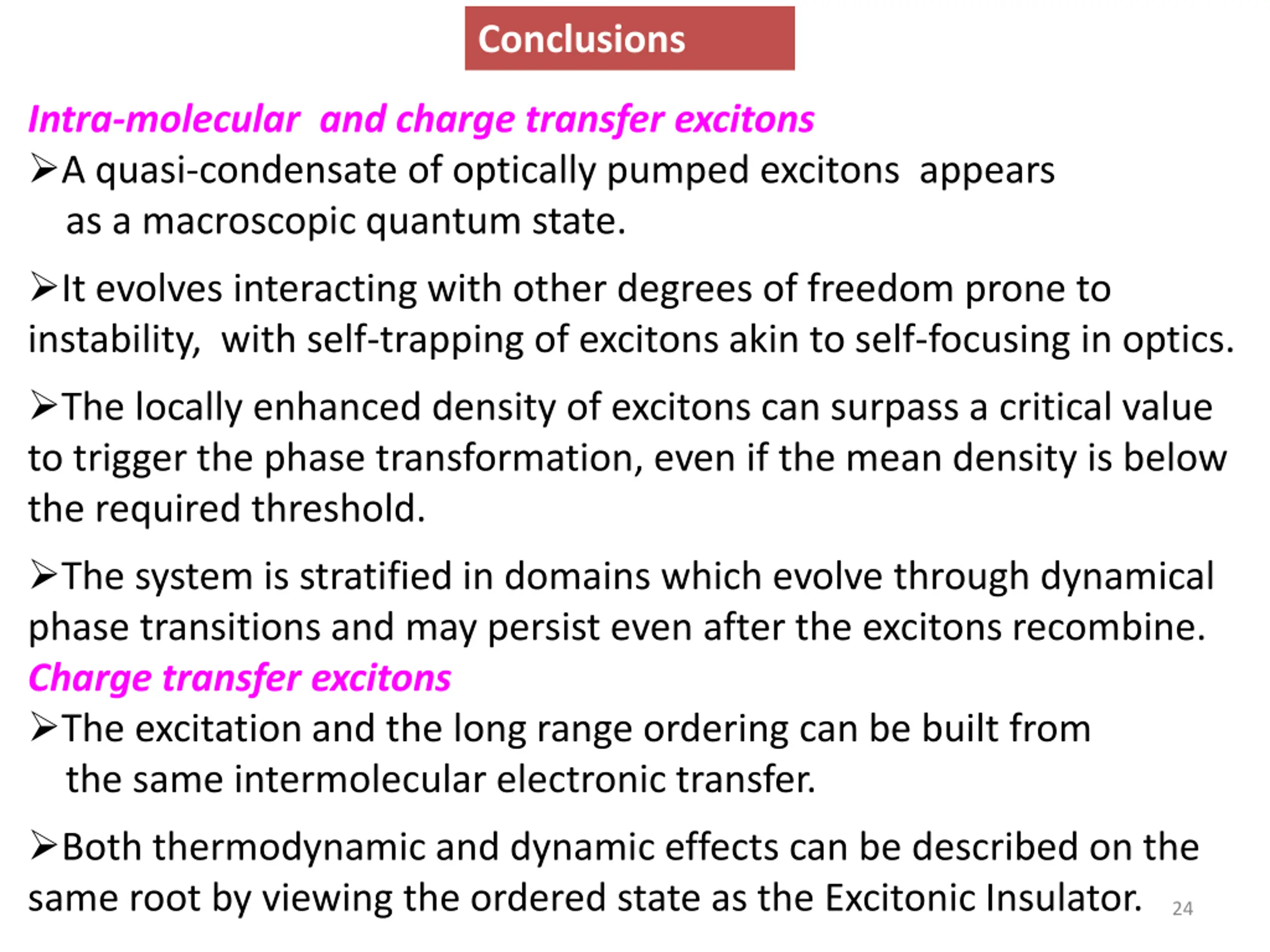 Conclusions Intra-molecular and charge transfer excitons A quasi-condensate of optically pumped excitons appears as a macroscopic quantum state. It evolves interacting with other degrees of freedom prone to instability, with self-trapping of excitons akin to self-focusing in optics. The locally enhanced density of excitons can surpass a critical value to trigger the phase transformation, even if the mean density is below the required threshold. The system is stratified in domains which evolve through dynamical phase transitions and may persist even after the excitons recombine. Charge transfer excitons The excitation and the long range ordering can be built from the same intermolecular electronic transfer. Both thermodynamic and dynamic effects can be described on the same root by viewing the ordered state as the Excitonic Insulator. 24