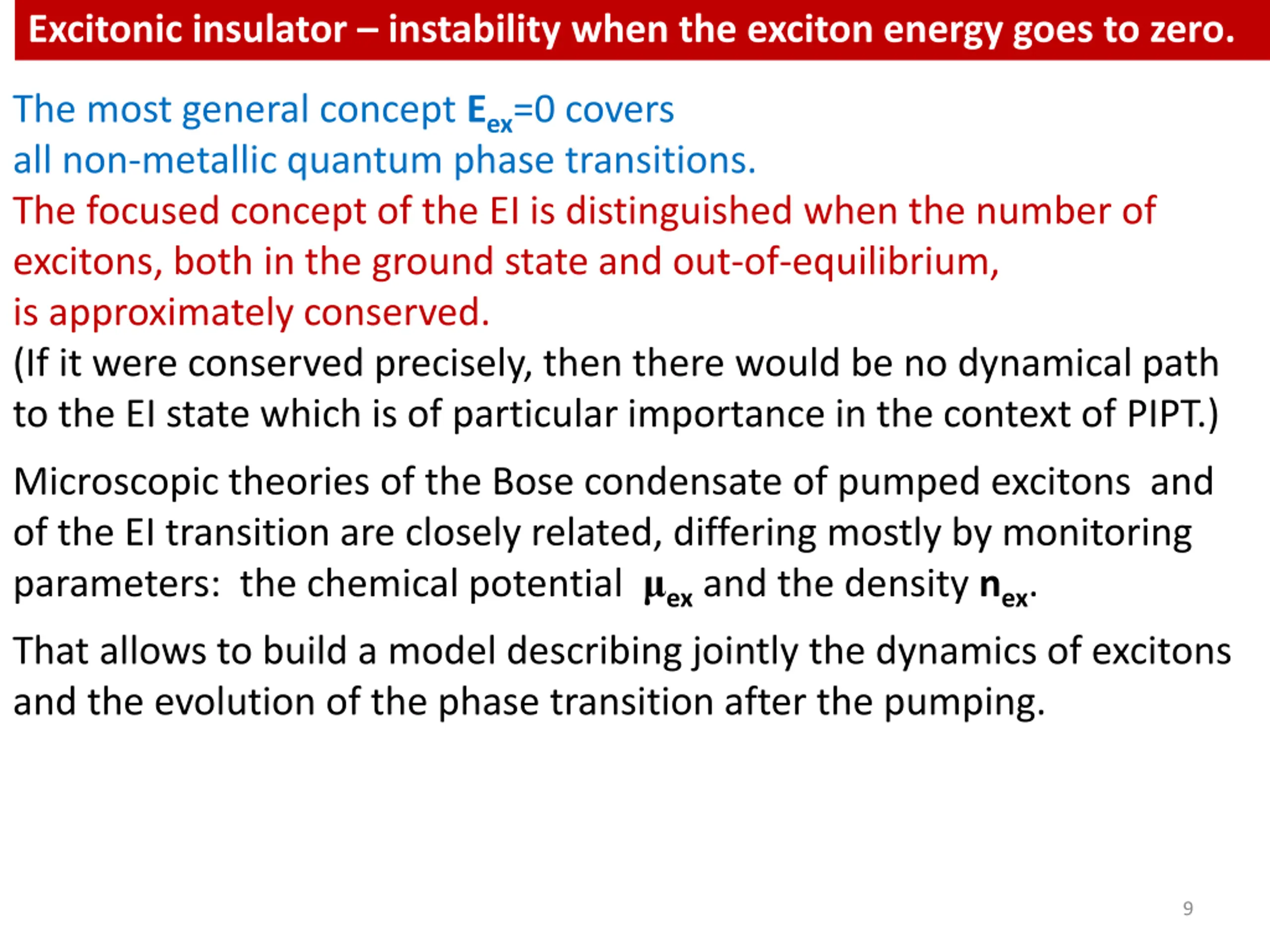 Excitonic insulator instability when the exciton energy goes to zero. The most general concept Eex=0 covers all non-metallic quantum phase transitions. The focused concept of the EI is distinguished when the number of excitons, both in the ground state and out-of-equilibrium, is approximately conserved. (If it were conserved precisely, then there would be no dynamical path to the EI state which is of particular importance in the context of PIPT.) Microscopic theories of the Bose condensate of pumped excitons and of the EI transition are closely related, differing mostly by monitoring parameters: the chemical potential exand the density nex. That allows to build a model describing jointly the dynamics of excitons and the evolution of the phase transition after the pumping. 9