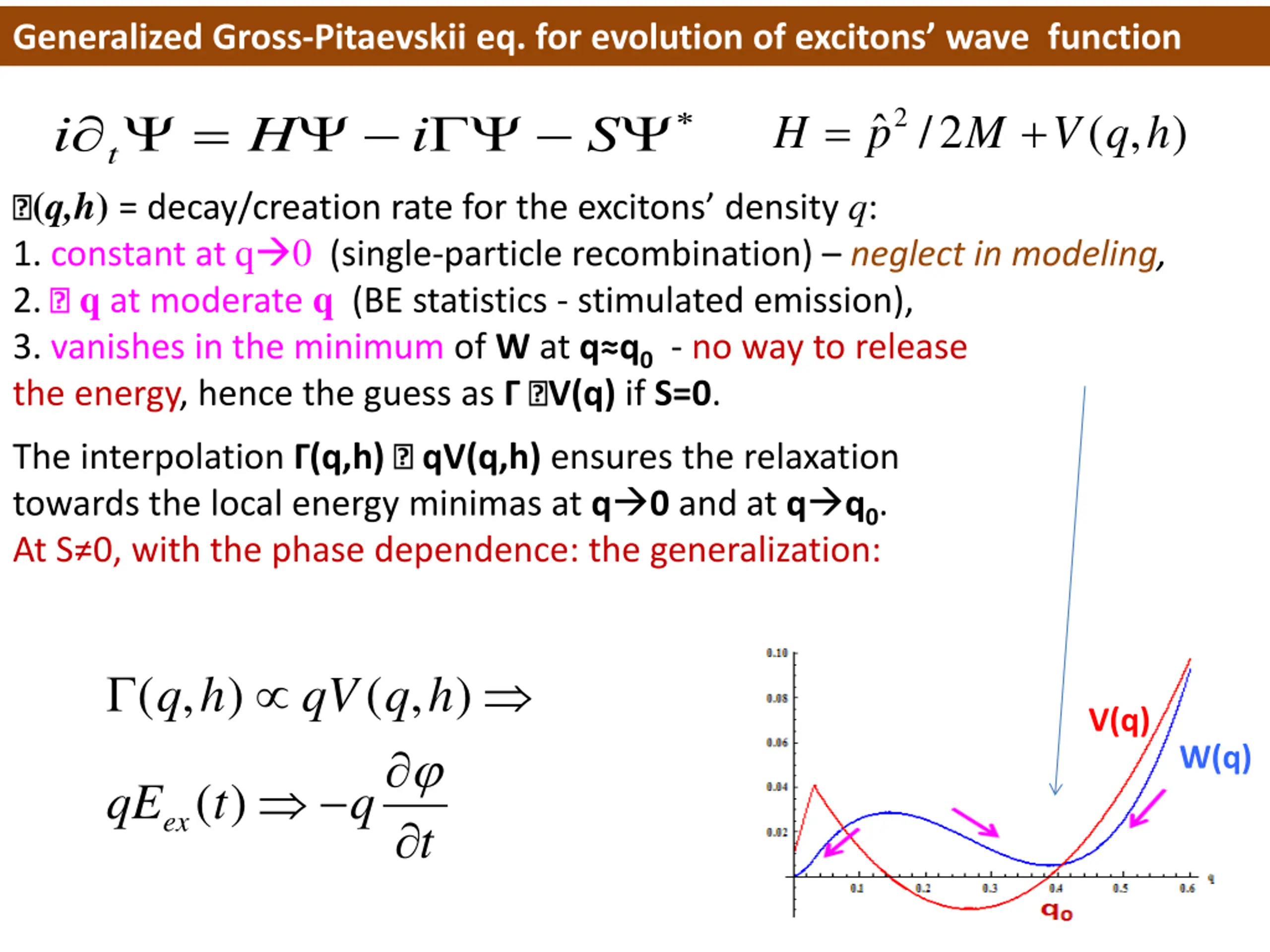 Generalized Gross-Pitaevskii eq. for evolution of excitons wave function = + = i 2 p / 2 ( , ) H M V q h i H S t (q,h) =decay/creation rate for the excitons density q: 1. constant at q 0 (single-particle recombination) neglect in modeling, 2. q at moderate q (BE statistics - stimulated emission), 3. vanishes in the minimum of W at q q0 - no way to release the energy, hence the guess as V(q) if S=0. The interpolation (q,h) qV(q,h) ensures the relaxation towards the local energy minimas at q 0 and at q q0. At S 0, with the phase dependence: the generalization: ( , ) ( , ) q h qV q h V(q) W(q) ( ) qE t q ex t