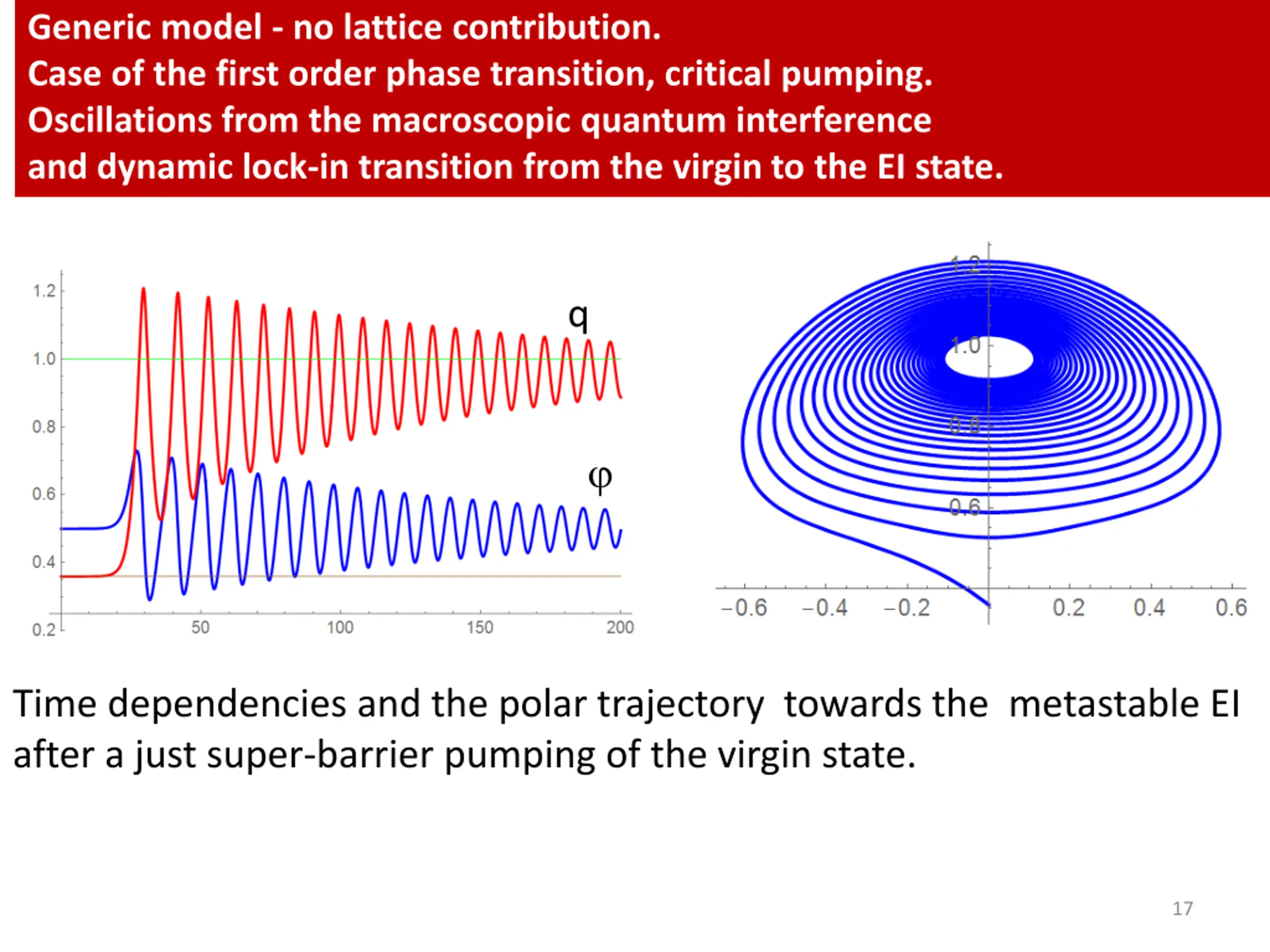 Generic model - no lattice contribution. Case of the first order phase transition, critical pumping. Oscillations from the macroscopic quantum interference and dynamic lock-in transition from the virgin to the EI state. q Time dependencies and the polar trajectory towards the metastable EI after a just super-barrier pumping of the virgin state. 17