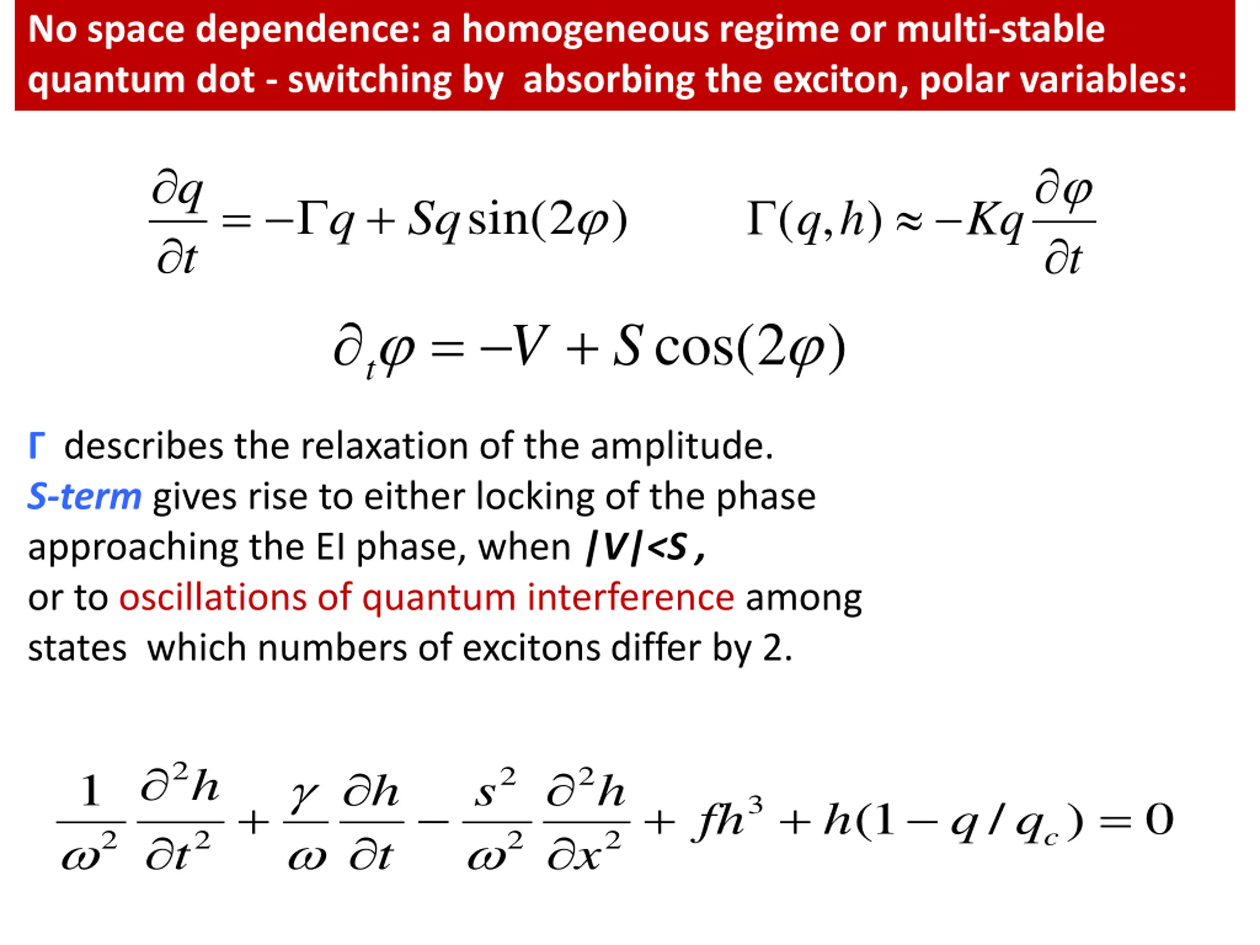 No space dependence: a homogeneous regime or multi-stable quantum dot - switching by absorbing the exciton, polar variables: q = + sin( 2 ) ( , ) q Sq q h Kq t t t = + cos( 2 ) V S describes the relaxation of the amplitude. S-term gives rise to either locking of the phase approaching the EI phase, when |V|<S , or to oscillations of quantum interference among states which numbers of excitons differ by 2. 2 h 2 2 1 h s h + + + = 3 1 ( h / ) 0 fh q c q 2 2 2 2 t t x