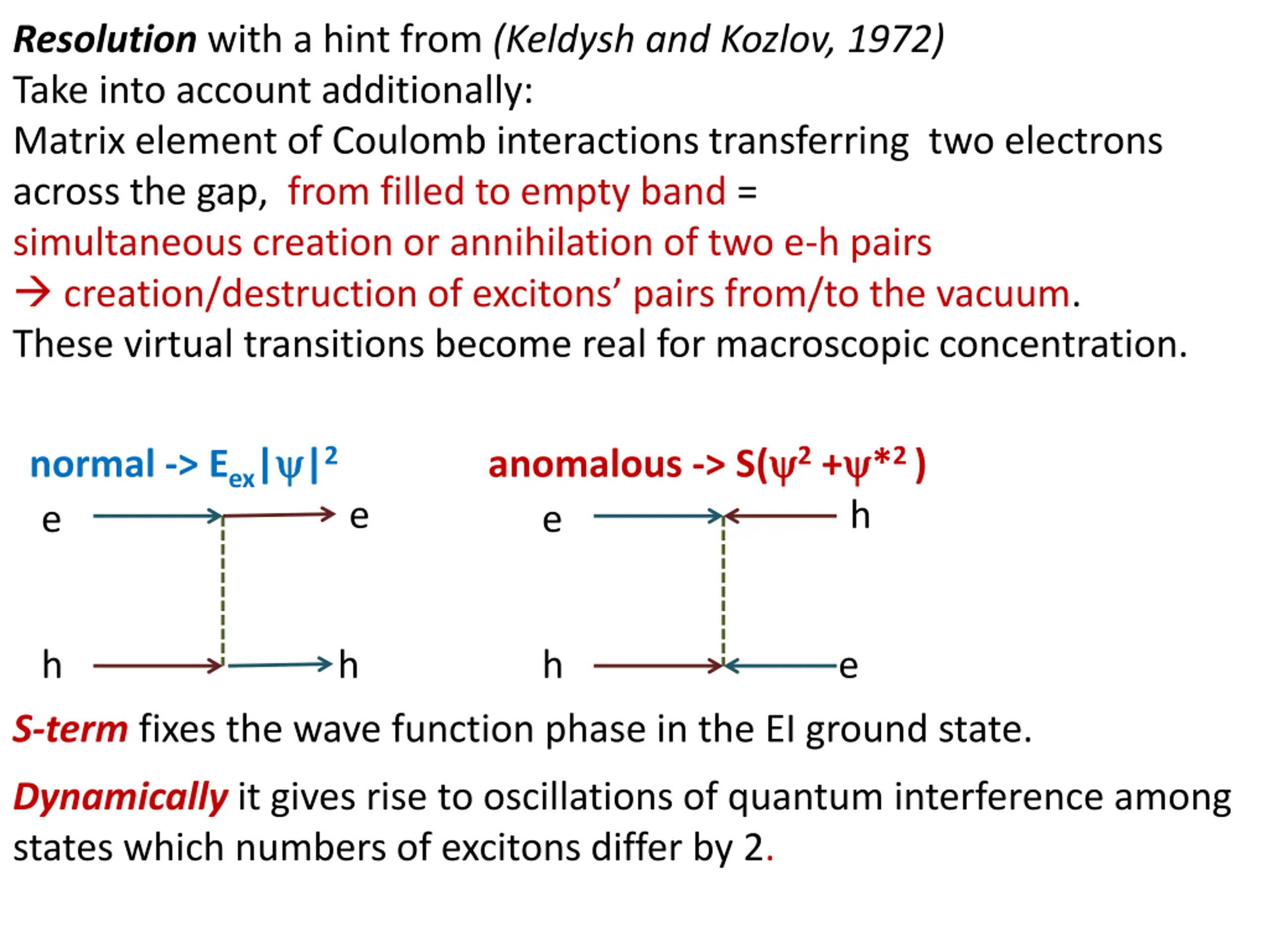 Resolution with a hint from (Keldysh and Kozlov, 1972) Take into account additionally: Matrix element of Coulomb interactions transferring two electrons across the gap, from filled to empty band = simultaneous creation or annihilation of two e-h pairs creation/destruction of excitons pairs from/to the vacuum. These virtual transitions become real for macroscopic concentration. normal -> Eex| |2 anomalous -> S( 2 + *2 ) e h e e h h h e S-term fixes the wave function phase in the EI ground state. Dynamically it gives rise to oscillations of quantum interference among states which numbers of excitons differ by 2.