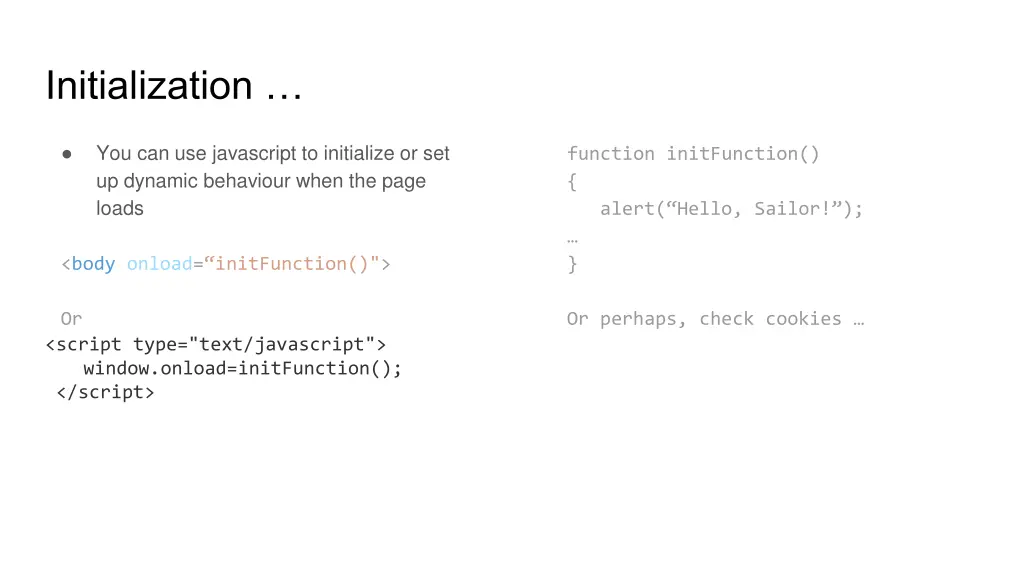 Initialization You can use javascript to initialize or set up dynamic behaviour when the page loads function initFunction() { alert( Hello, Sailor! ); } <body onload= initFunction()"> Or Or perhaps, check cookies <script type="text/javascript"> window.onload=initFunction(); </script>