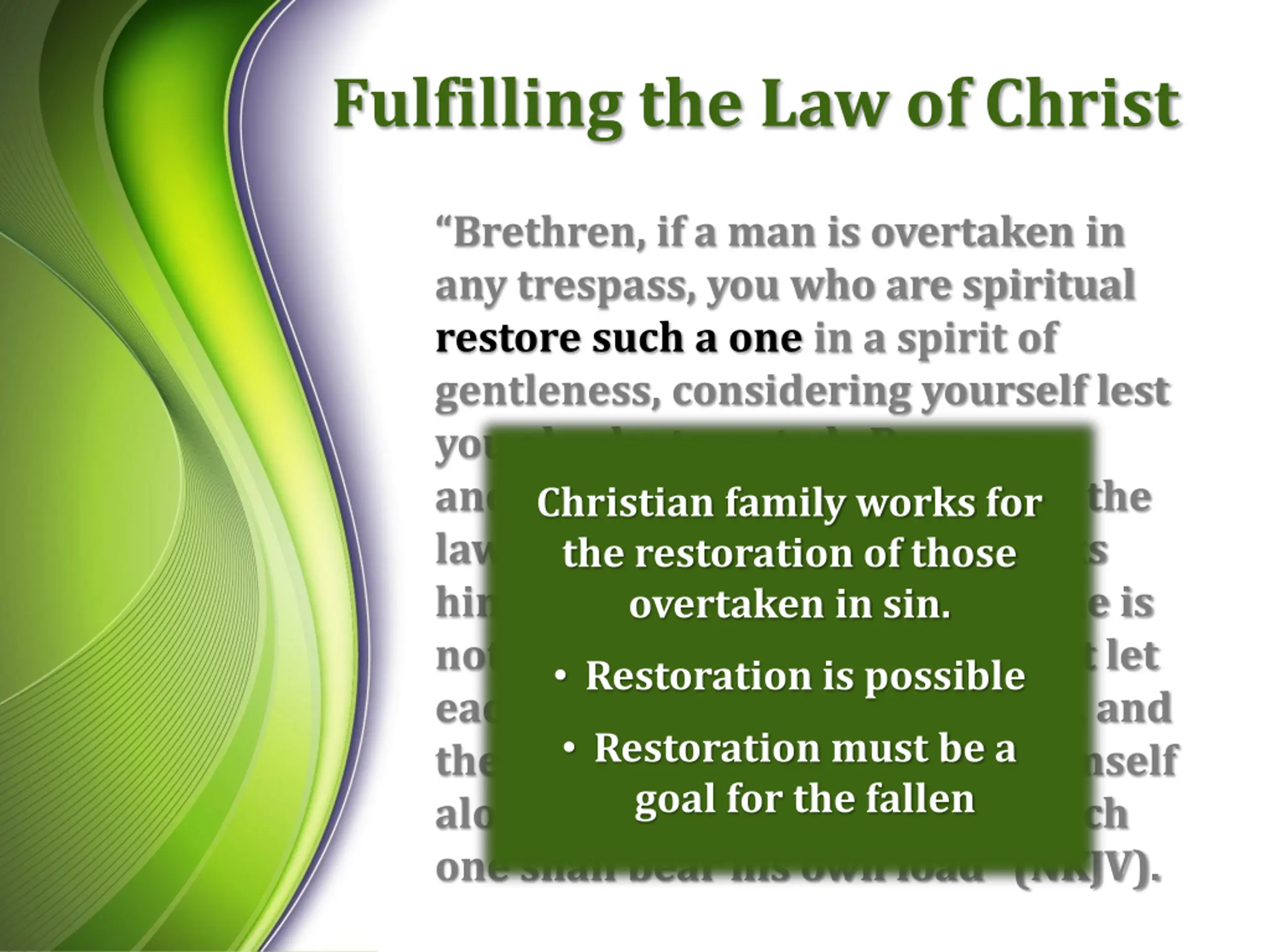 Fulfilling the Law of Christ Brethren, if a man is overtaken in any trespass, you who are spiritual restore such a one in a spirit of gentleness, considering yourself lest you also be tempted. Bear one another s burdens, and so fulfill the law of Christ. For if anyone thinks himself to be something, when he is nothing, he deceives himself. But let each one examine his own work, and then he will have rejoicing in himself alone, and not in another. For each one shall bear his own load (NKJV). Christian family works for the restoration of those overtaken in sin. Restoration is possible Restoration must be a goal for the fallen