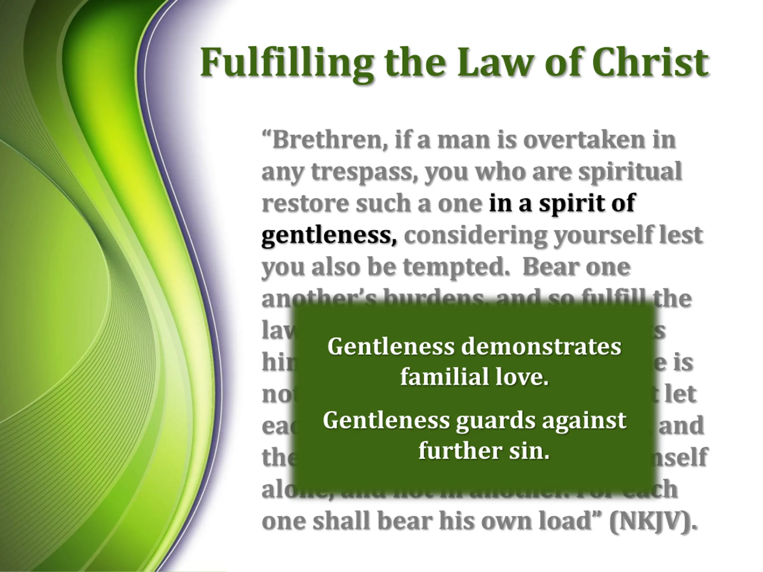 Fulfilling the Law of Christ Brethren, if a man is overtaken in any trespass, you who are spiritual restore such a one in a spirit of gentleness, considering yourself lest you also be tempted. Bear one another s burdens, and so fulfill the law of Christ. For if anyone thinks himself to be something, when he is nothing, he deceives himself. But let each one examine his own work, and then he will have rejoicing in himself alone, and not in another. For each one shall bear his own load (NKJV). Gentleness demonstrates familial love. Gentleness guards against further sin.