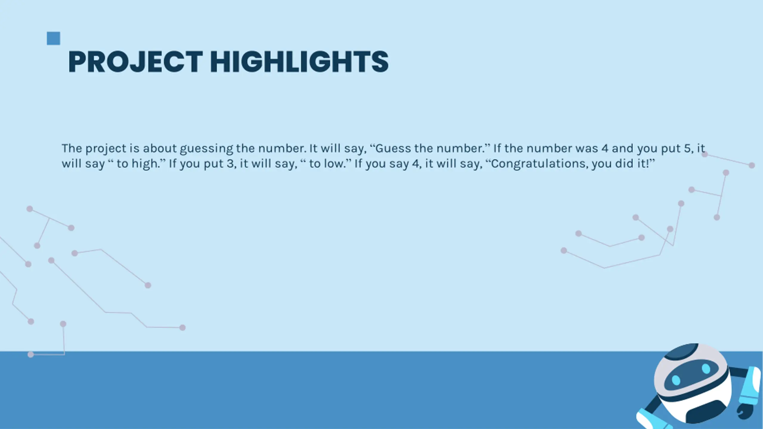 PROJECT HIGHLIGHTS The project is about guessing the number. It will say, Guess the number. If the number was 4 and you put 5, it will say to high. If you put 3, it will say, to low. If you say 4, it will say, Congratulations, you did it!