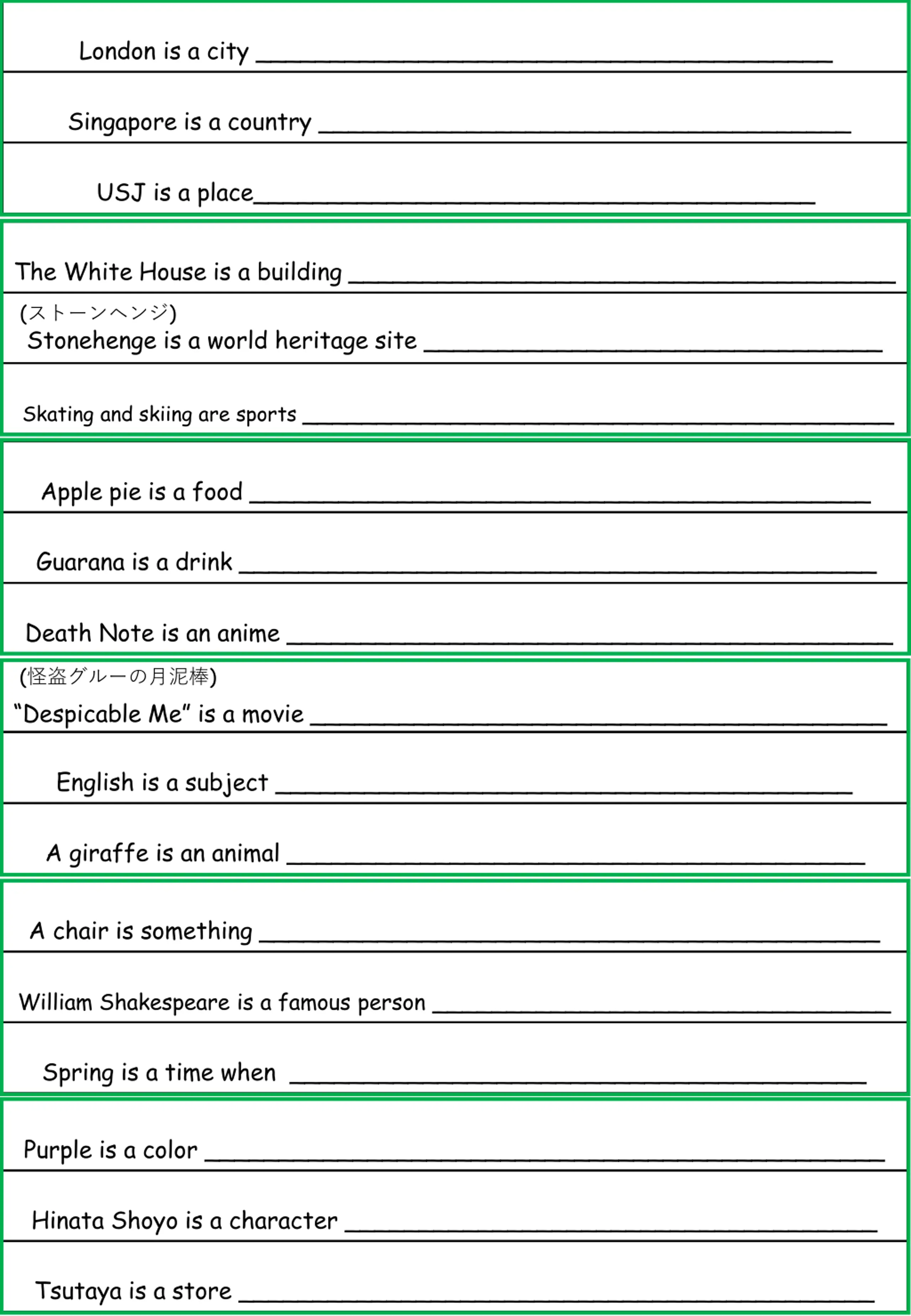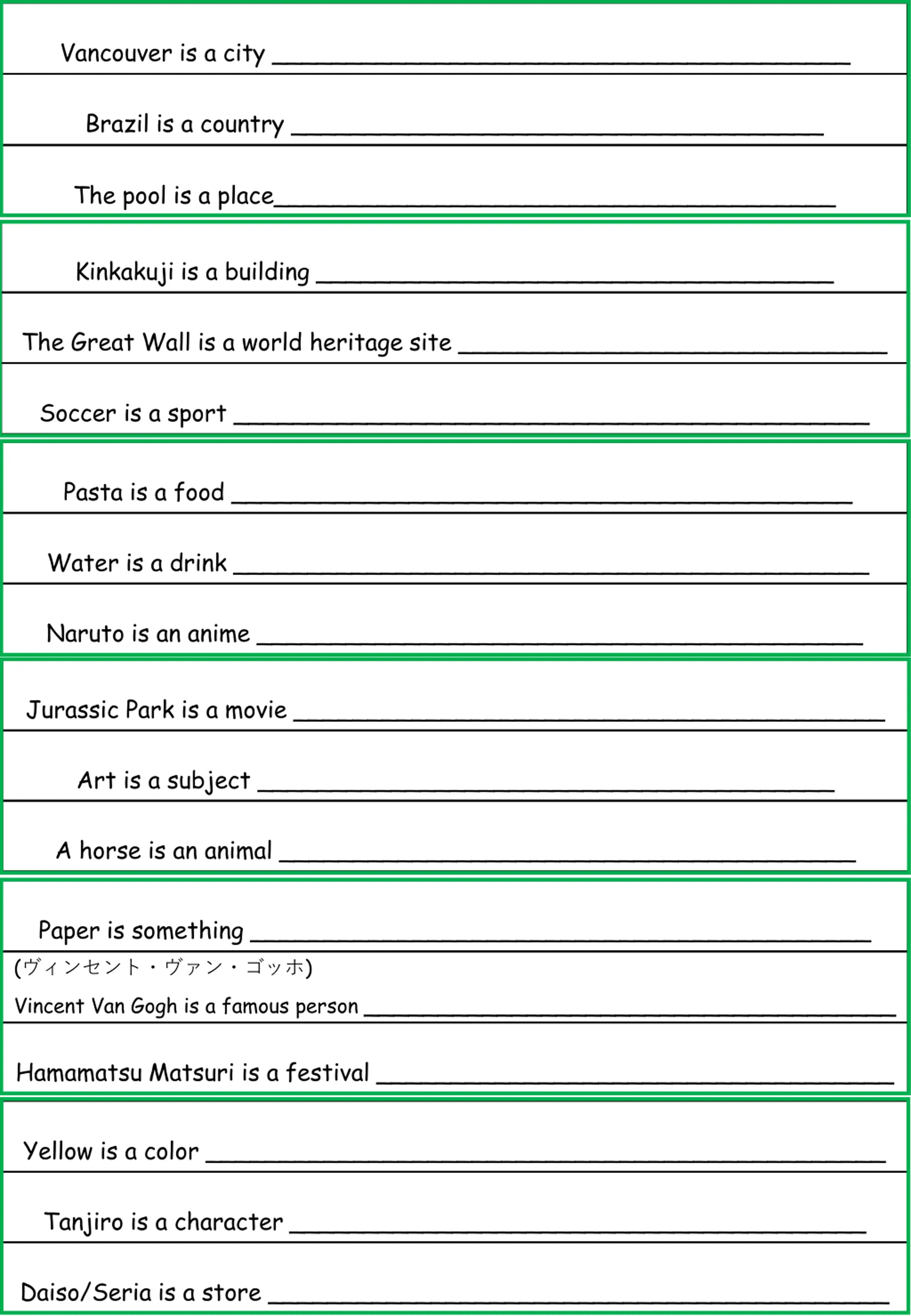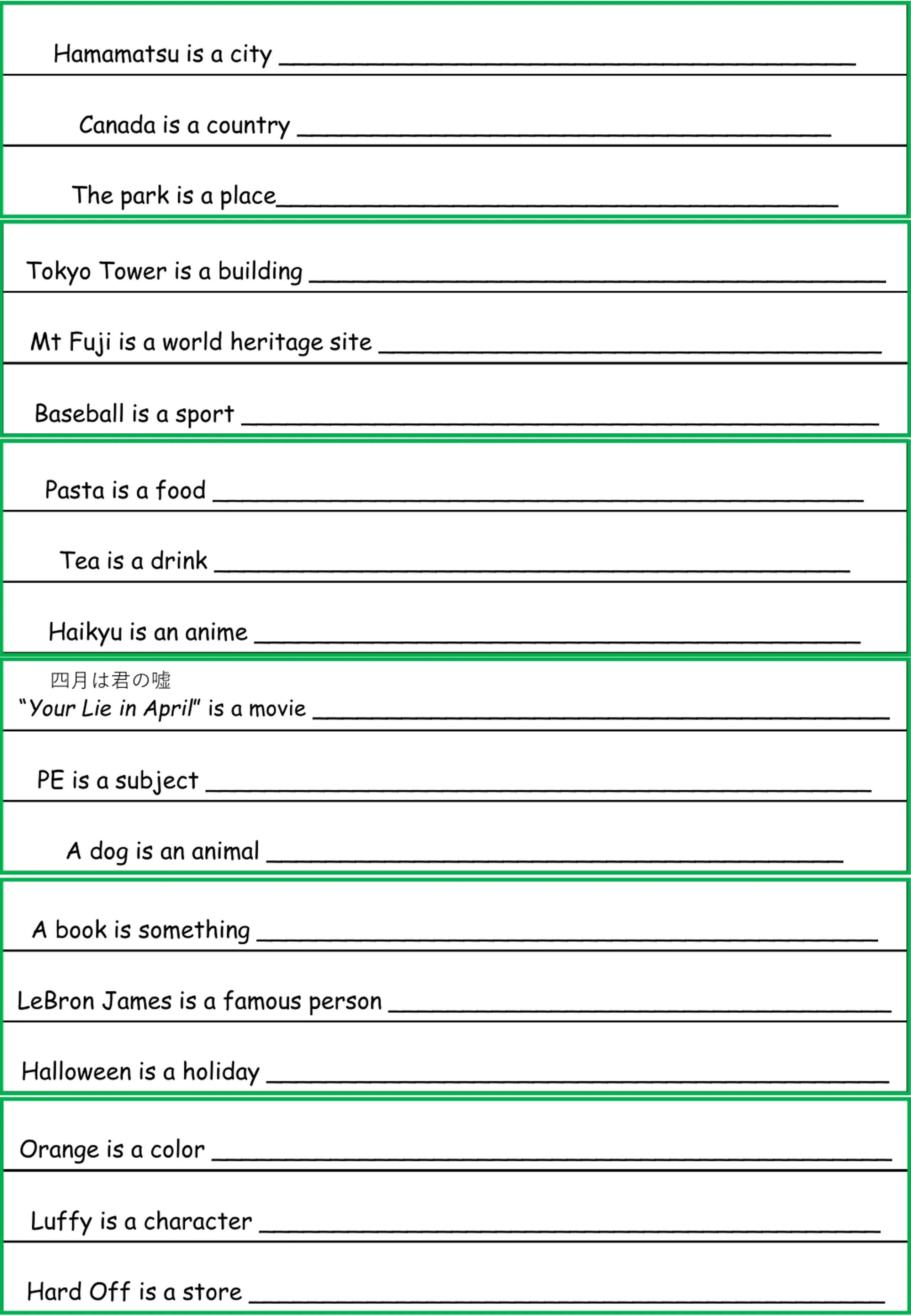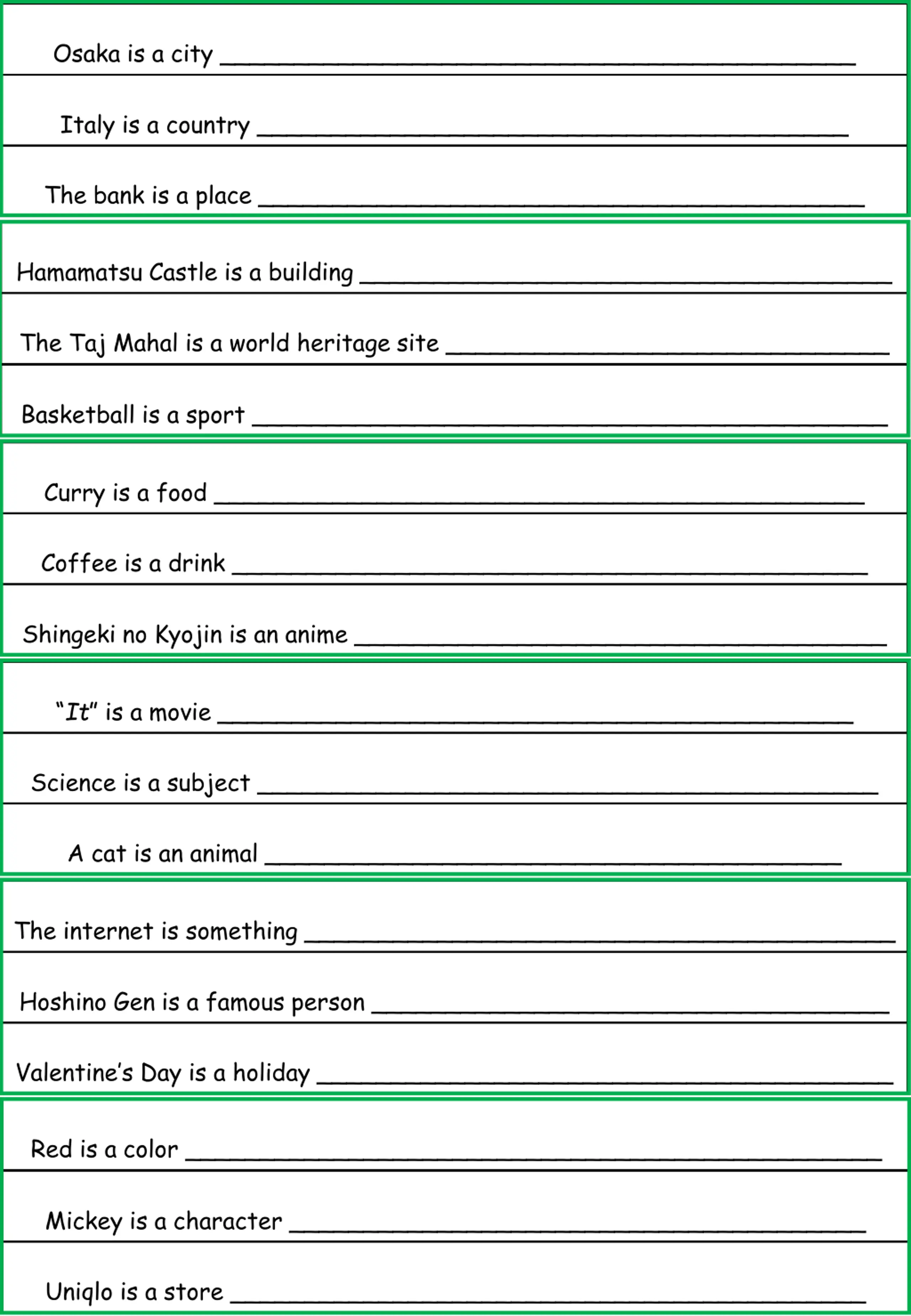 Osaka is a city ___________________________________________ Italy is a country ________________________________________ The bank is a place _________________________________________ Hamamatsu Castle is a building ____________________________________ The Taj Mahal is a world heritage site ______________________________ Basketball is a sport ___________________________________________ Curry is a food ____________________________________________ Coffee is a drink ___________________________________________ Shingeki no Kyojin is an anime ____________________________________ It is a movie ___________________________________________ Science is a subject __________________________________________ A cat is an animal _______________________________________ The internet is something ________________________________________ Hoshino Gen is a famous person ___________________________________ Valentine s Day is a holiday _______________________________________ Red is a color _______________________________________________ Mickey is a character _______________________________________ Uniqlo is a store ___________________________________________