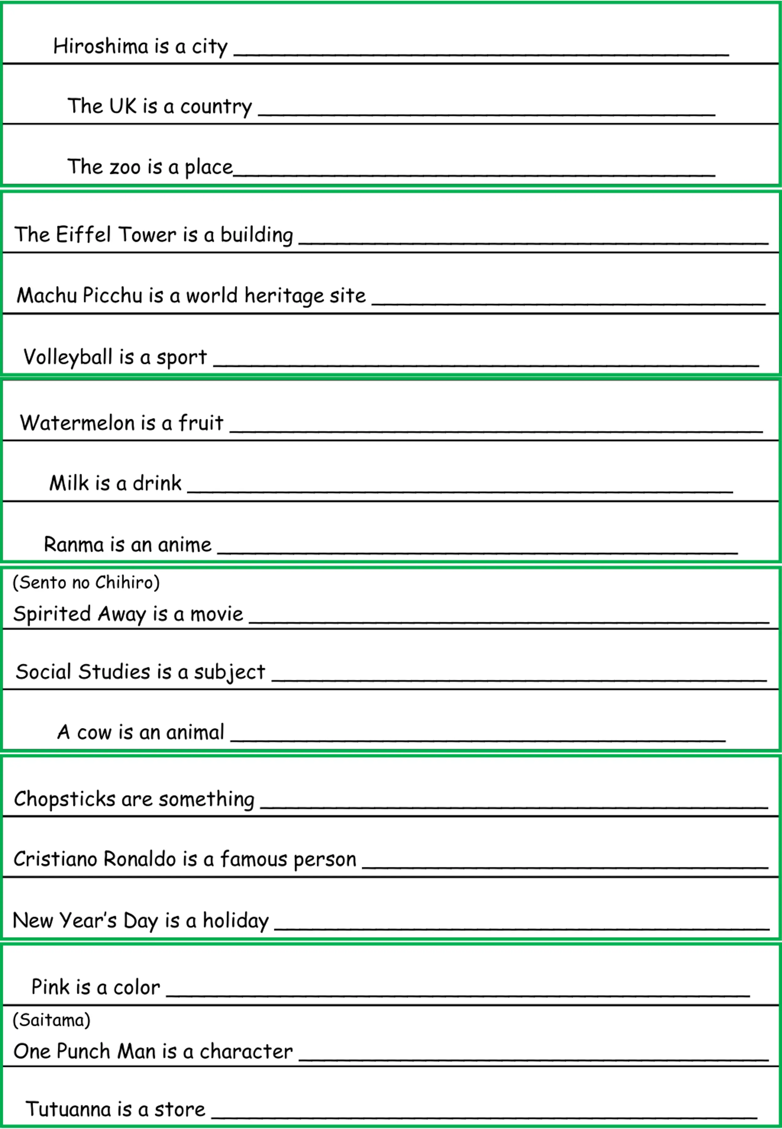 Hiroshima is a city _______________________________________ The UK is a country ____________________________________ The zoo is a place______________________________________ The Eiffel Tower is a building _____________________________________ Machu Picchu is a world heritage site _______________________________ Volleyball is a sport ___________________________________________ Watermelon is a fruit __________________________________________ Milk is a drink ___________________________________________ Ranma is an anime _________________________________________ (Sento no Chihiro) Spirited Away is a movie _________________________________________ Social Studies is a subject _______________________________________ A cow is an animal _______________________________________ Chopsticks are something ________________________________________ Cristiano Ronaldo is a famous person ________________________________ New Year s Day is a holiday _______________________________________ Pink is a color ______________________________________________ (Saitama) One Punch Man is a character _____________________________________ Tutuanna is a store ___________________________________________