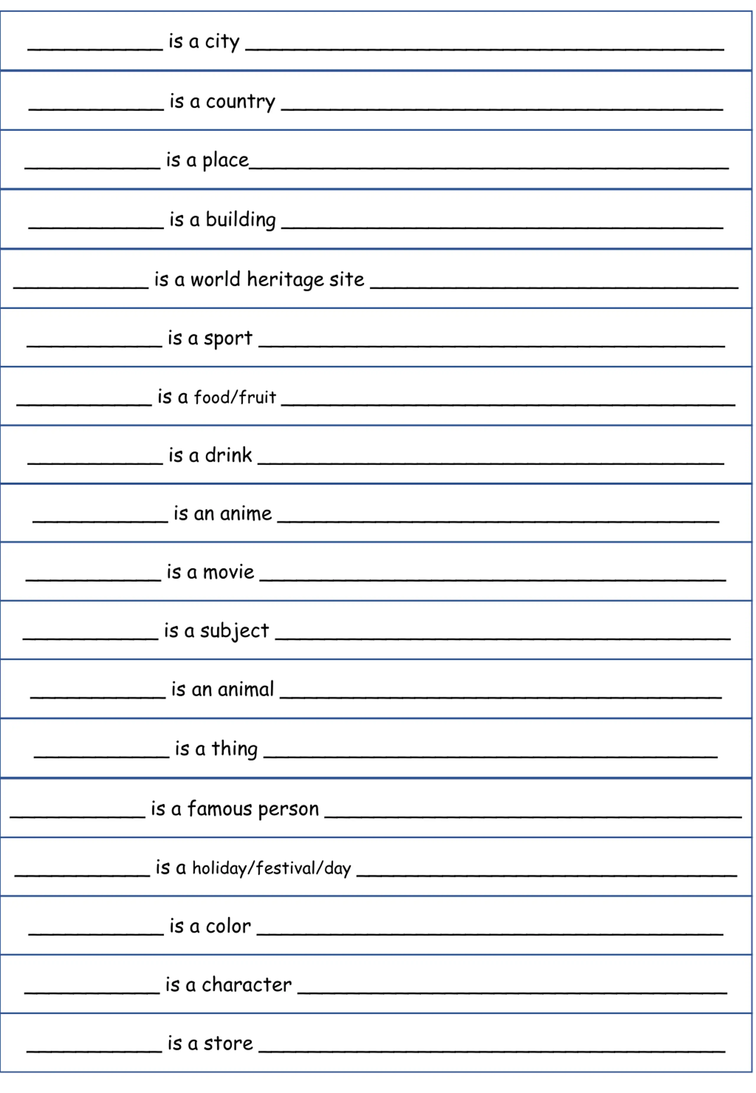 ___________ is a city _______________________________________ ___________ is a country ____________________________________ ___________ is a place_______________________________________ ___________ is a building ____________________________________ ___________ is a world heritage site ______________________________ ___________ is a sport ______________________________________ ___________ is a food/fruit _____________________________________ ___________ is a drink ______________________________________ ___________ is an anime ____________________________________ ___________ is a movie ______________________________________ ___________ is a subject _____________________________________ ___________ is an animal ____________________________________ ___________ is a thing _____________________________________ ___________ is a famous person __________________________________ ___________ is a holiday/festival/day _______________________________ ___________ is a color ______________________________________ ___________ is a character ___________________________________ ___________ is a store ______________________________________