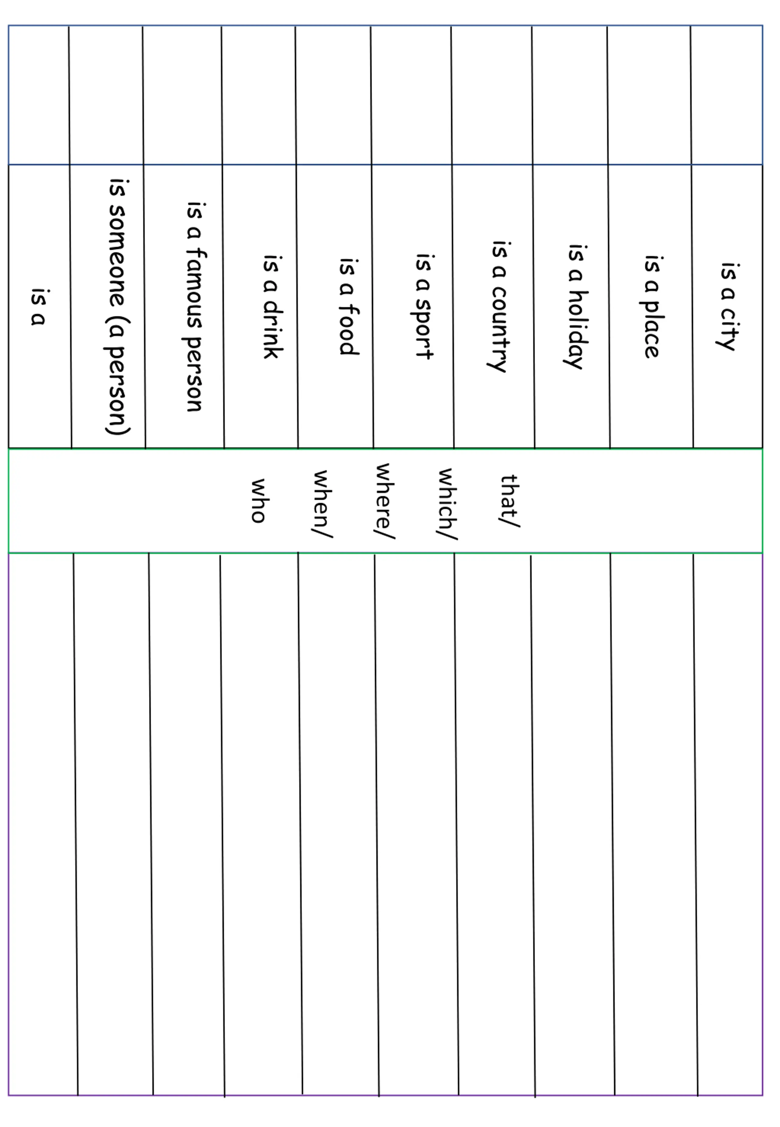 London is a city _______________________________________ Singapore is a country ____________________________________ USJ is a place______________________________________ The White House is a building _____________________________________ ( ) Stonehenge is a world heritage site _______________________________ Skating and skiing are sports ________________________________________ Apple pie is a food __________________________________________ Guarana is a drink ___________________________________________ Death Note is an anime _________________________________________ ( ) Despicable Me is a movie _______________________________________ English is a subject _______________________________________ A giraffe is an animal _______________________________________ A chair is something __________________________________________ William Shakespeare is a famous person _______________________________ Spring is a time when _______________________________________ Purple is a color ______________________________________________ Hinata Shoyo is a character ____________________________________ Tsutaya is a store ___________________________________________