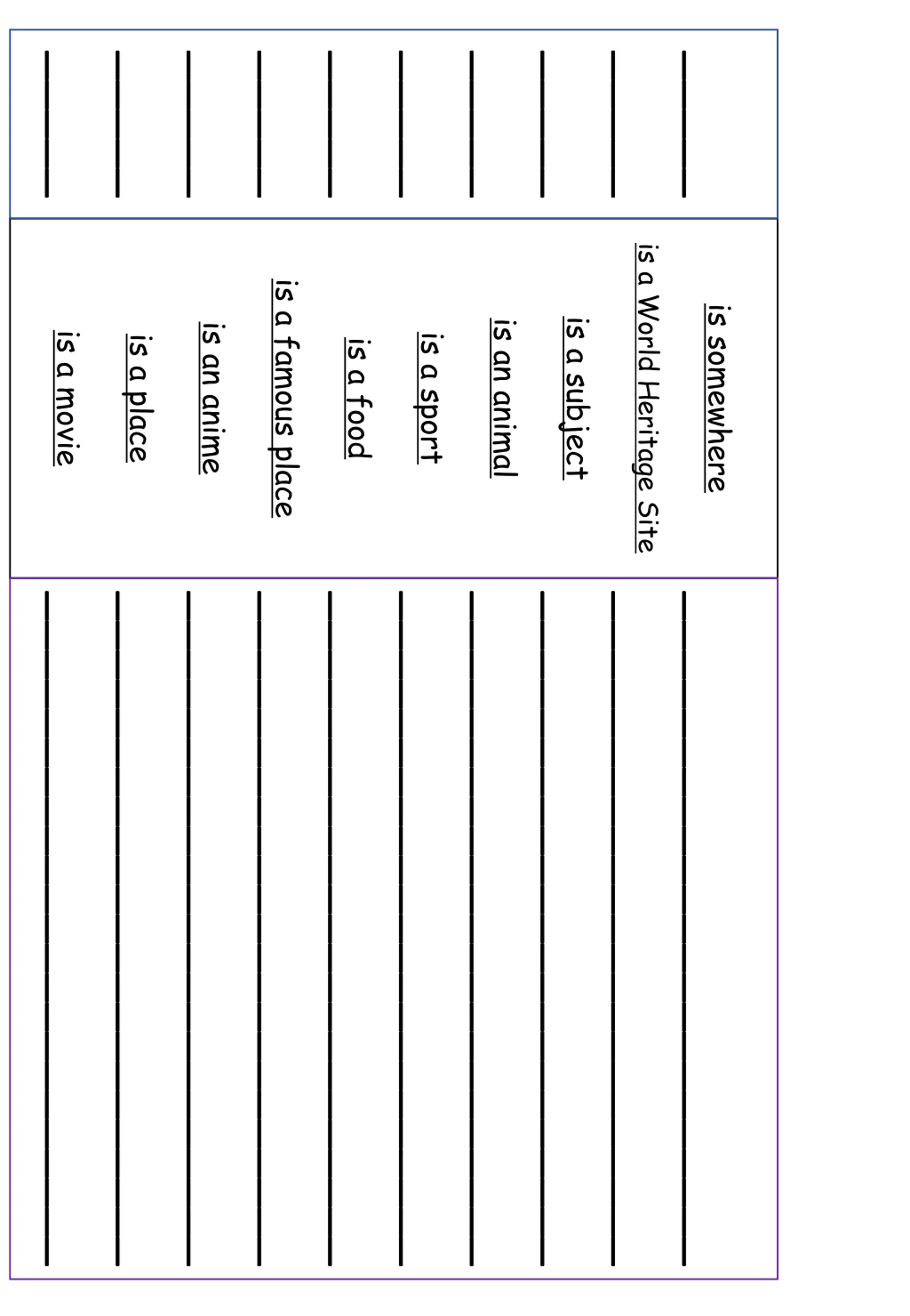 _____ _____ _____ _____ _____ _____ _____ _____ _____ _____ is a World Heritage Site is a famous place is somewhere is a subject is an animal is an anime is a movie is a sport is a place is a food _______________________ _______________________ _______________________ _______________________ _______________________ _______________________ _______________________ _______________________ _______________________ _______________________