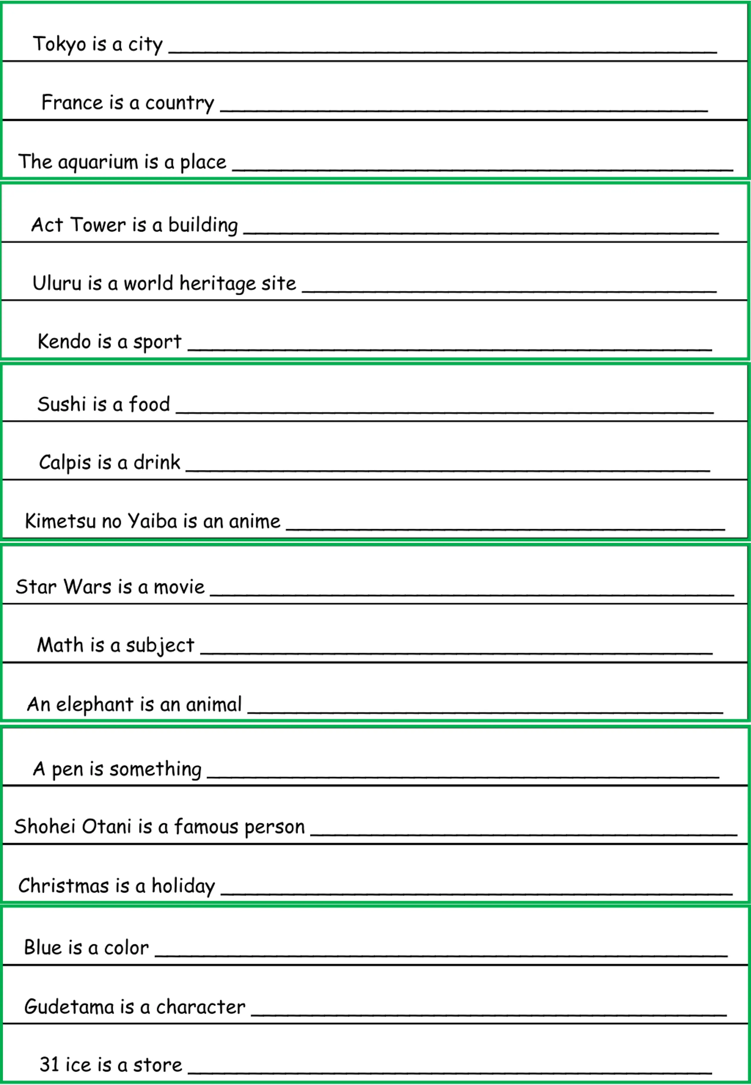 Tokyo is a city _____________________________________________ France is a country ________________________________________ The aquarium is a place _________________________________________ Act Tower is a building _______________________________________ Uluru is a world heritage site __________________________________ Kendo is a sport ___________________________________________ Sushi is a food ____________________________________________ Calpis is a drink ___________________________________________ Kimetsu no Yaiba is an anime ____________________________________ Star Wars is a movie ___________________________________________ Math is a subject __________________________________________ An elephant is an animal _______________________________________ A pen is something __________________________________________ Shohei Otani is a famous person ___________________________________ Christmas is a holiday __________________________________________ Blue is a color _______________________________________________ Gudetama is a character _______________________________________ 31 ice is a store ___________________________________________