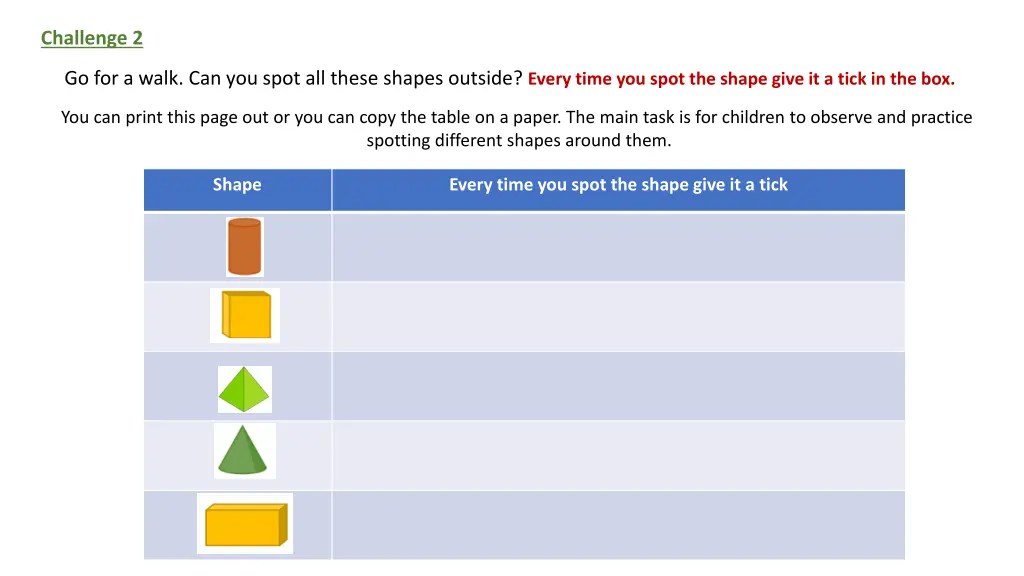 Challenge 2 Go for a walk. Can you spot all these shapes outside? Every time you spot the shape give it a tick in the box. You can print this page out or you can copy the table on a paper. The main task is for children to observe and practice spotting different shapes around them. Shape Every time you spot the shape give it a tick