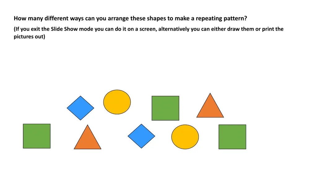 How many different ways can you arrange these shapes to make a repeating pattern? (If you exit the Slide Show mode you can do it on a screen, alternatively you can either draw them or print the pictures out)