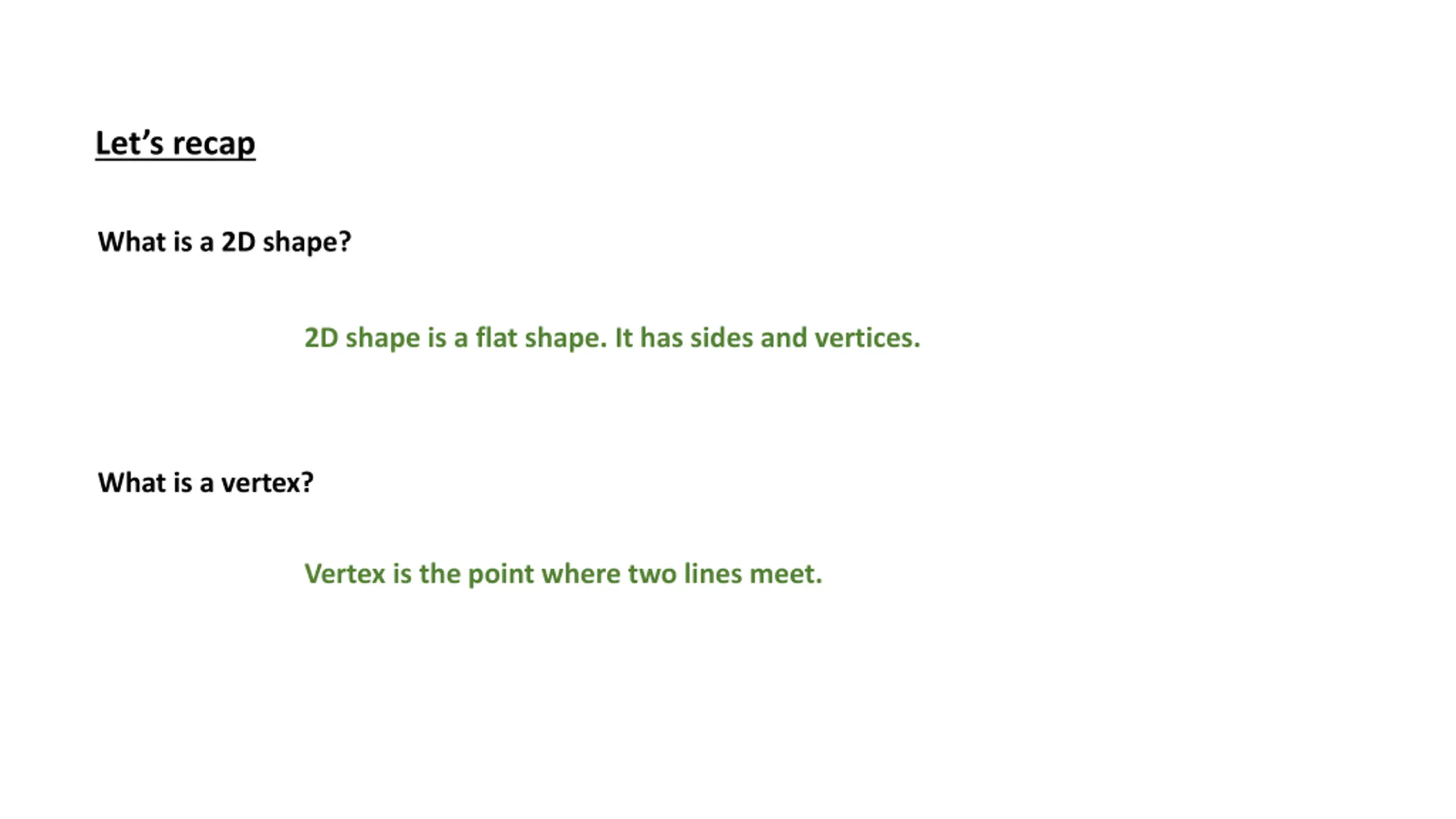 Lets recap What is a 2D shape? 2D shape is a flat shape. It has sides and vertices. What is a vertex? Vertex is the point where two lines meet.