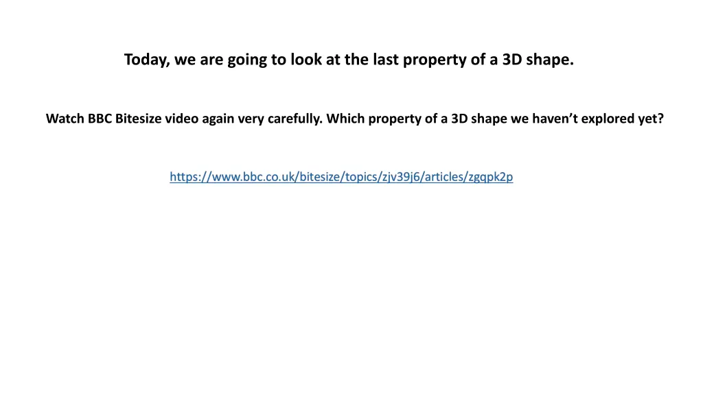 Today, we are going to look at the last property of a 3D shape. Watch BBC Bitesize video again very carefully. Which property of a 3D shape we haven t explored yet?