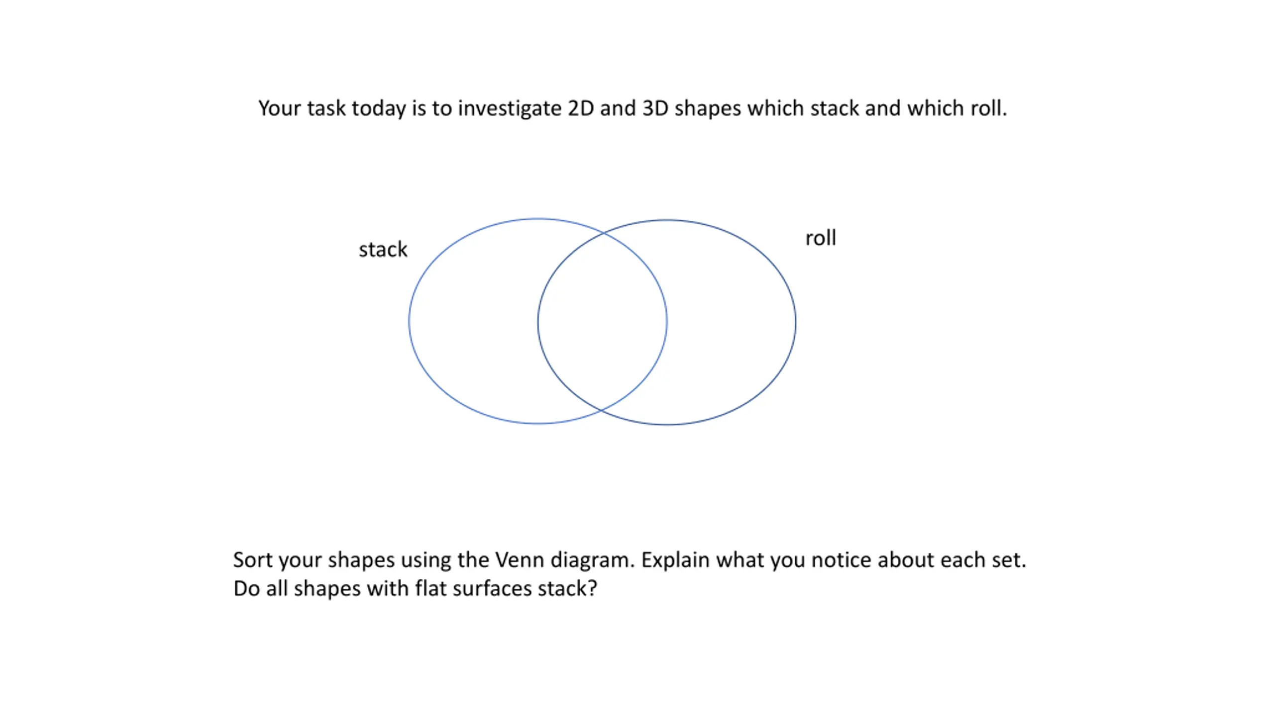 Your task today is to investigate 2D and 3D shapes which stack and which roll. roll stack Sort your shapes using the Venn diagram. Explain what you notice about each set. Do all shapes with flat surfaces stack?