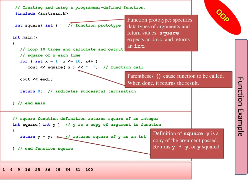 // Creating and using a programmer-defined function. #include <iostream.h> int square( int ); // function prototype int main() { // loop 10 times and calculate and output // square of x each time for ( int x = 1; x <= 10; x++ ) cout << square( x ) << " "; // function call cout << endl; return 0; // indicates successful termination } // end main Function prototype: specifies data types of arguments and return values. square expects an int, and returns an int. Parentheses () cause function to be called. When done, it returns the result. Function Example // square function definition returns square of an integer int square( int y ) // y is a copy of argument to function { return y * y; // returns square of y as an int } // end function square Definition of square. y is a copy of the argument passed. Returns y * y, or y squared. 1 4 9 16 25 36 49 64 81 100