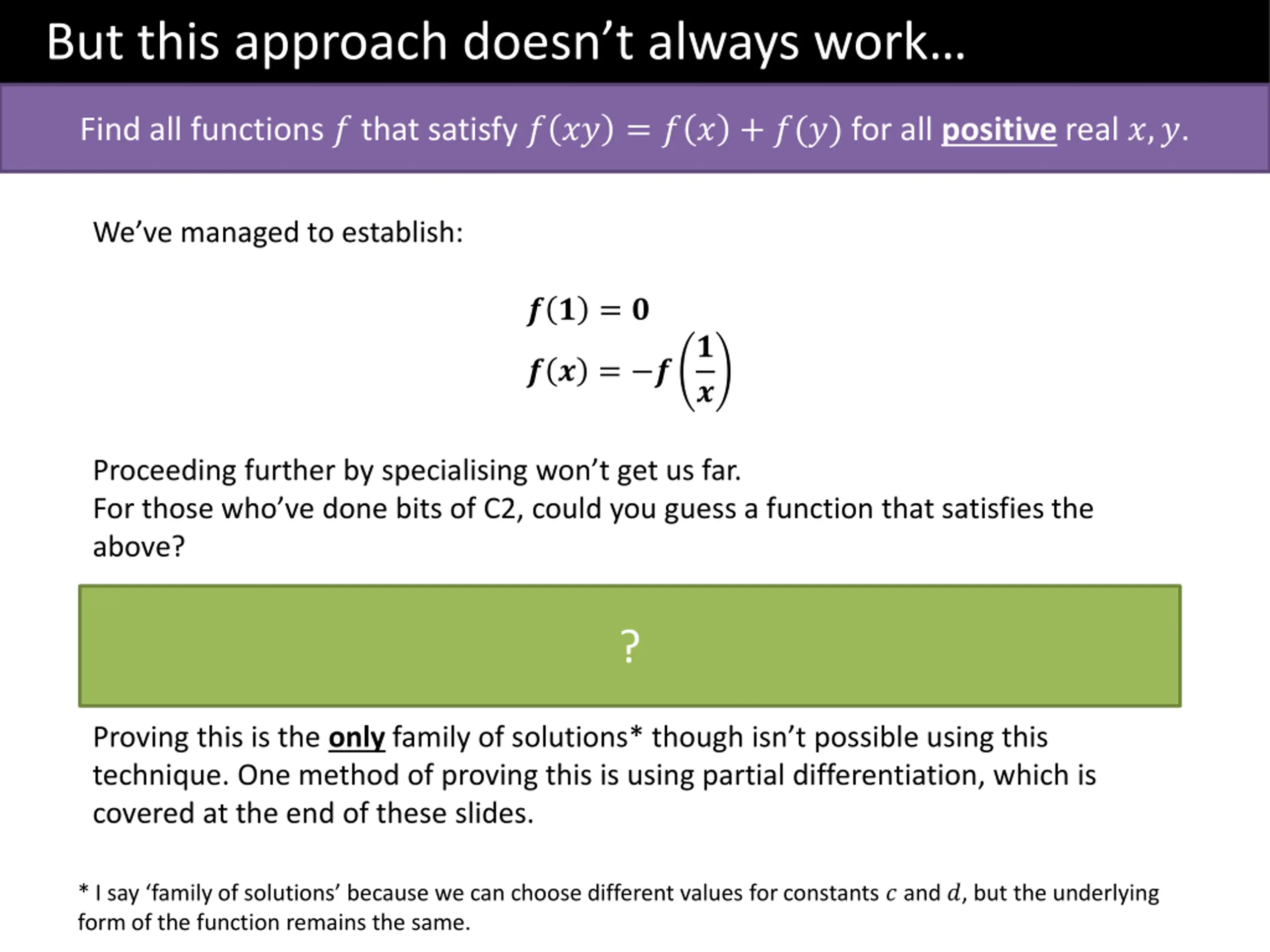 But this approach doesnt always work Find all functions ? that satisfy ? ?? = ? ? + ?(?) for all positive real ?,?. We ve managed to establish: ? ? = ? ? ? ? ? = ? Proceeding further by specialising won t get us far. For those who ve done bits of C2, could you guess a function that satisfies the above? ? ? = ????? + ? (where ? and ? are constants) ? Proving this is the onlyfamily of solutions* though isn t possible using this technique. One method of proving this is using partial differentiation, which is covered at the end of these slides. * I say family of solutions because we can choose different values for constants ? and ?, but the underlying form of the function remains the same.
