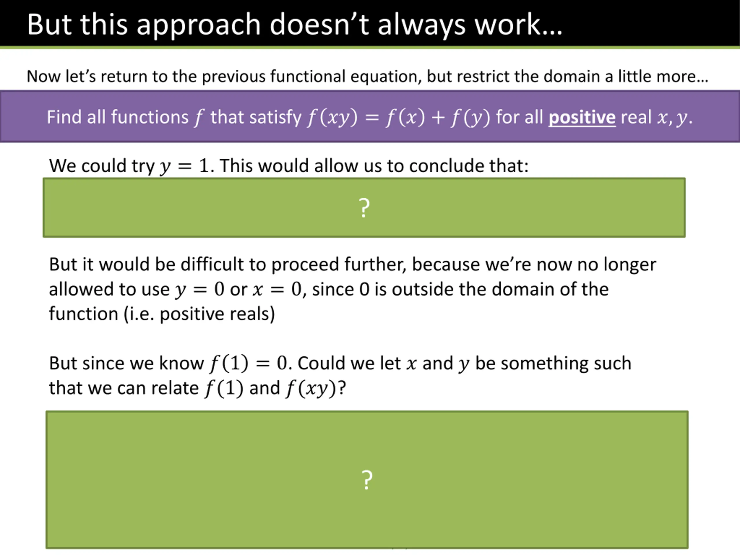 But this approach doesnt always work Now let s return to the previous functional equation, but restrict the domain a little more Find all functions ? that satisfy ? ?? = ? ? + ?(?) for all positive real ?,?. We could try ? = 1. This would allow us to conclude that: ? ? = ? ? + ?(?) Thus ? ? = ? ? But it would be difficult to proceed further, because we re now no longer allowed to use ? = 0 or ? = 0, since 0 is outside the domain of the function (i.e. positive reals) But since we know ? 1 = 0. Could we let ? and ? be something such that we can relate ?(1) and ?(??)? Let ? =? ?, then: ? ? ? ? = ? ? + ? ? ? ? ? ? = ?
