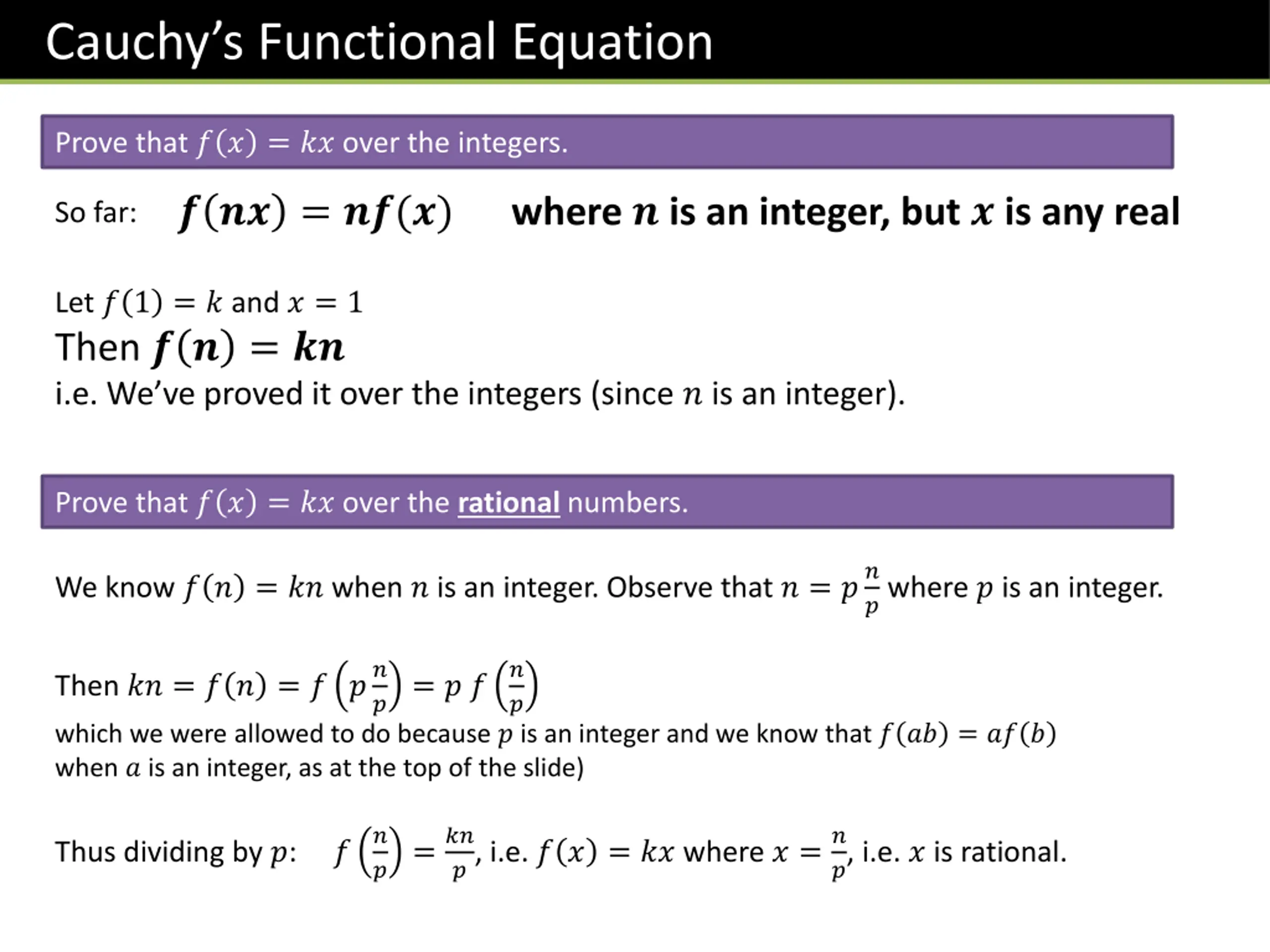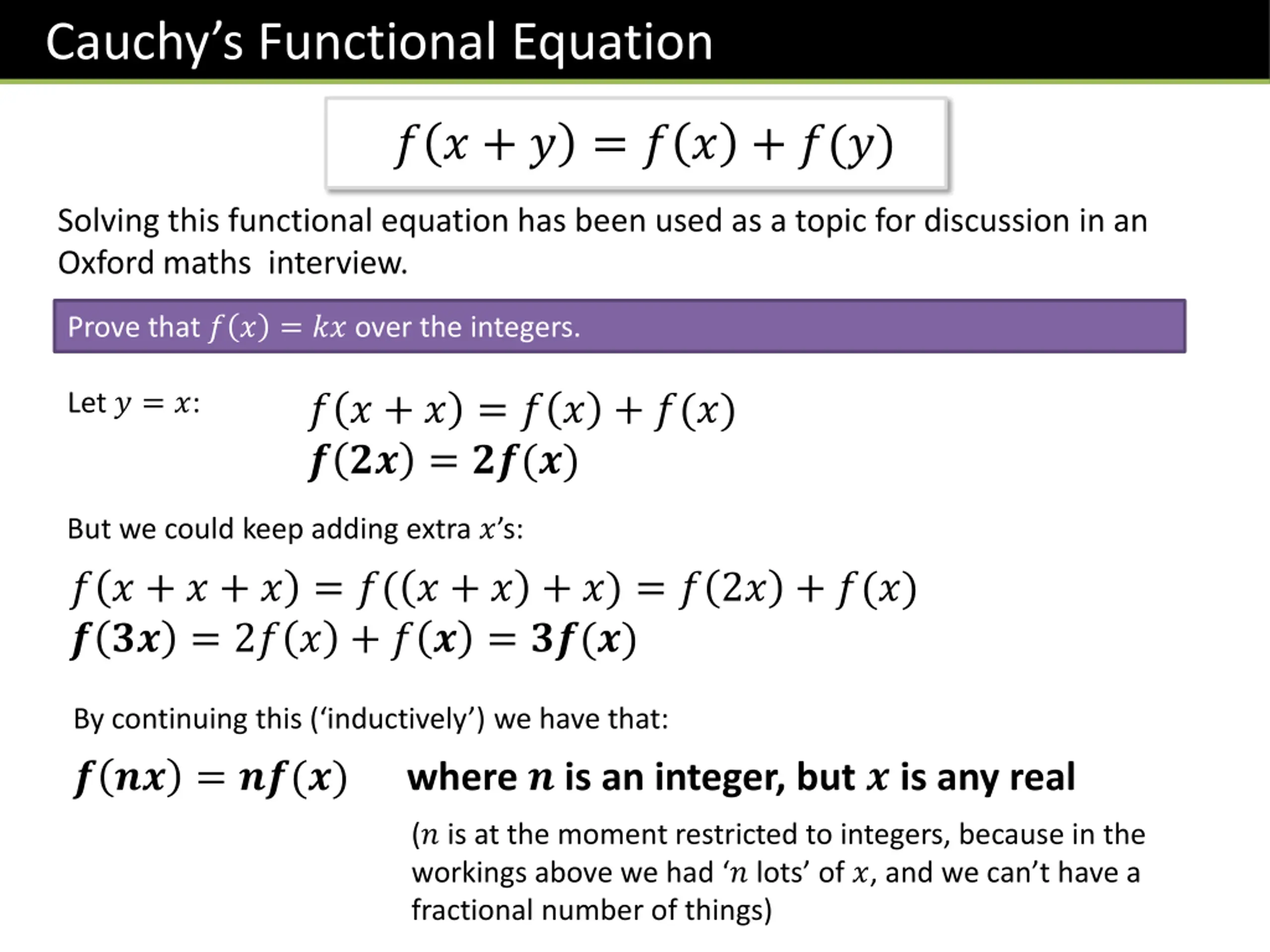 Cauchys Functional Equation ? ? + ? = ? ? + ?(?) Solving this functional equation has been used as a topic for discussion in an Oxford maths interview. Prove that ? ? = ?? over the integers. Let ? = ?: ? ? + ? = ? ? + ?(?) ? ?? = ??(?) But we could keep adding extra ? s: ? ? + ? + ? = ?( ? + ? + ?) = ? 2? + ?(?) ? ?? = 2? ? + ? ? = ??(?) By continuing this ( inductively ) we have that: ? ?? = ??(?) where ? is an integer, but ? is any real (? is at the moment restricted to integers, because in the workings above we had ?lots of ?, and we can t have a fractional number of things)