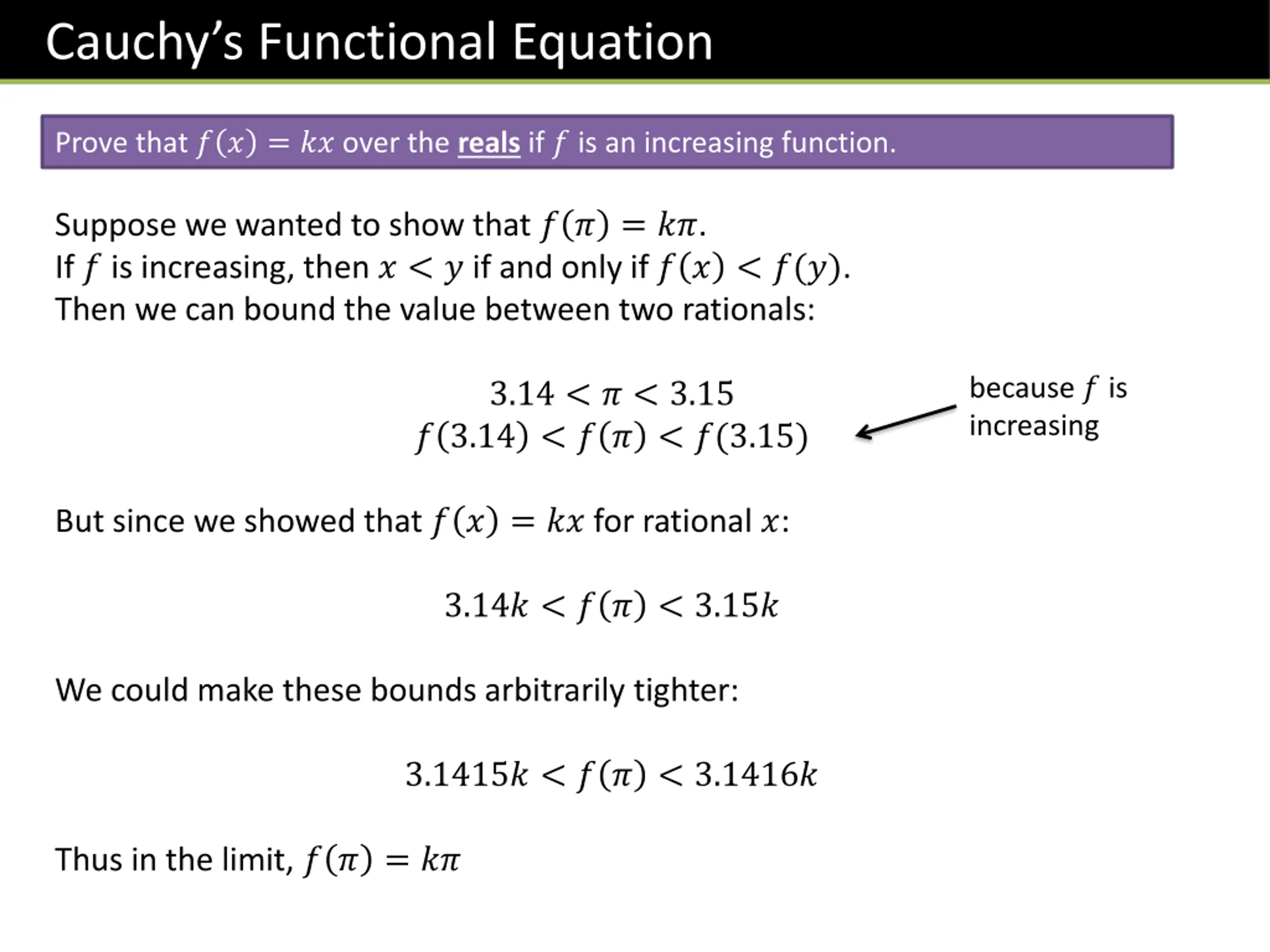 Cauchys Functional Equation Prove that ? ? = ?? over the reals if ? is an increasing function. Suppose we wanted to show that ? ? = ??. If ? is increasing, then ? < ? if and only if ? ? < ?(?). Then we can bound the value between two rationals: because ? is increasing 3.14 < ? < 3.15 ? 3.14 < ? ? < ?(3.15) But since we showed that ? ? = ?? for rational ?: 3.14? < ? ? < 3.15? We could make these bounds arbitrarily tighter: 3.1415? < ? ? < 3.1416? Thus in the limit, ? ? = ??