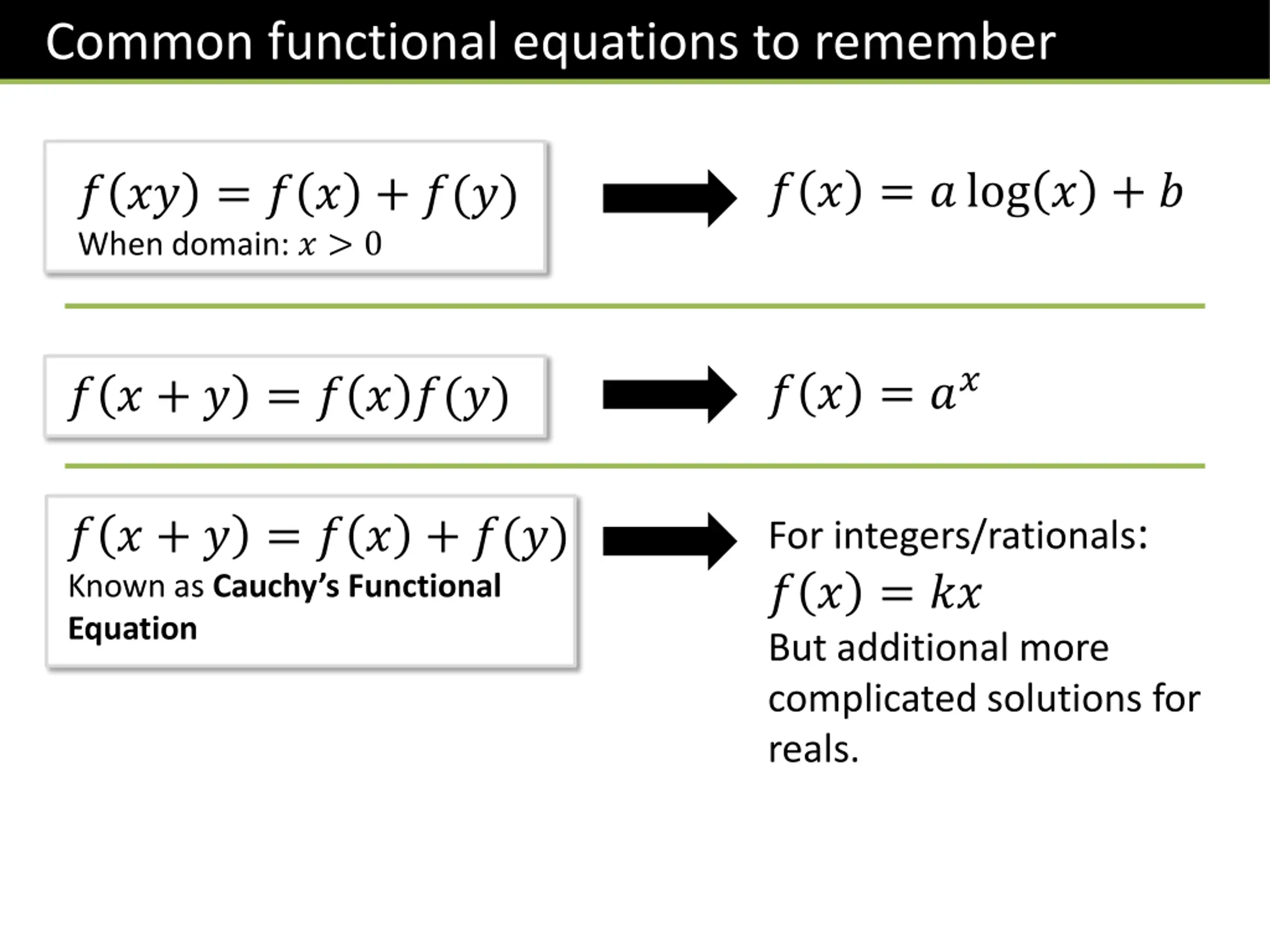 Common functional equations to remember ? ? = ?log ? + ? ? ?? = ? ? + ?(?) When domain: ? > 0 ? ? = ?? ? ? + ? = ? ? ?(?) For integers/rationals: ? ? = ?? But additional more complicated solutions for reals. ? ? + ? = ? ? + ?(?) Known as Cauchy s Functional Equation