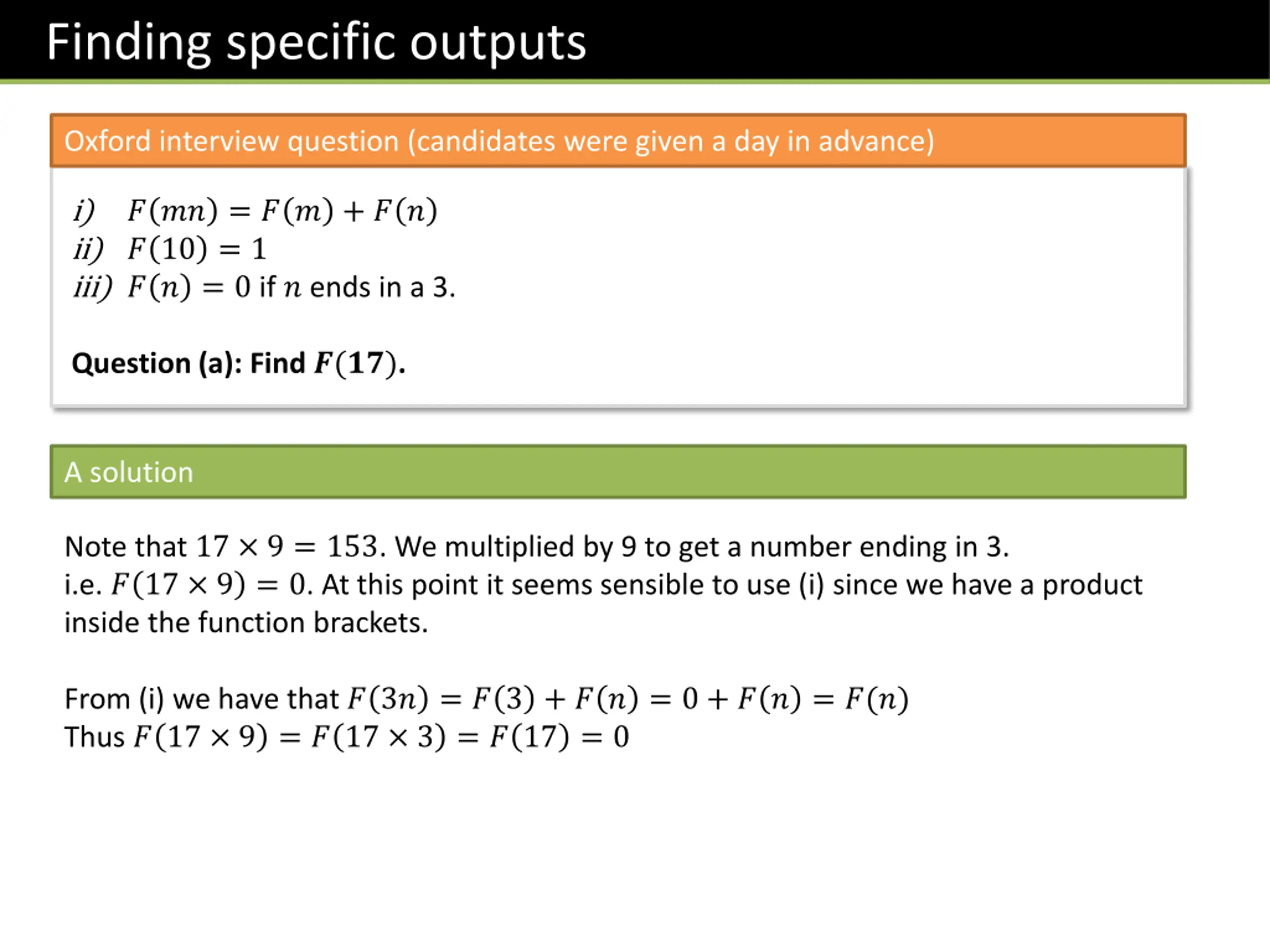 Finding specific outputs Oxford interview question (candidates were given a day in advance) i) ii) ? 10 = 1 iii) ? ? = 0 if ? ends in a 3. ? ?? = ? ? + ? ? Question (a): Find ?(??). A solution Note that 17 9 = 153. We multiplied by 9 to get a number ending in 3. i.e. ? 17 9 = 0. At this point it seems sensible to use (i) since we have a product inside the function brackets. From (i) we have that ? 3? = ? 3 + ? ? = 0 + ? ? = ?(?) Thus ? 17 9 = ? 17 3 = ? 17 = 0