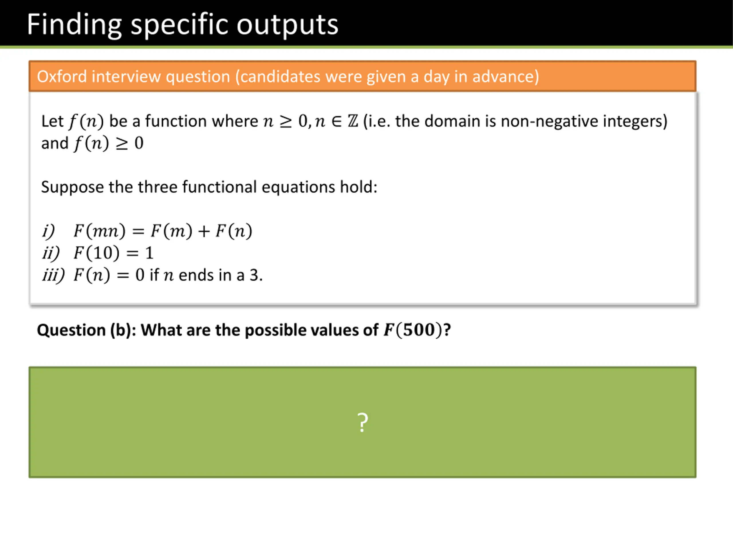 Finding specific outputs Oxford interview question (candidates were given a day in advance) Let ?(?) be a function where ? 0,? (i.e. the domain is non-negative integers) and ? ? 0 Suppose the three functional equations hold: i) ii) ? 10 = 1 iii) ? ? = 0 if ? ends in a 3. ? ?? = ? ? + ? ? Question (b): What are the possible values of ? ??? ? By using (i), ? 500 = ? 10 + ? 10 + ? 5 = 2 + ?(5) Note that ? 10 = 1 = ? 2 + ?(5). But since ? ? 0 for all ?, ? 5 must be 0 or 1. ? Thus ?(500) could either be 2 or 3.