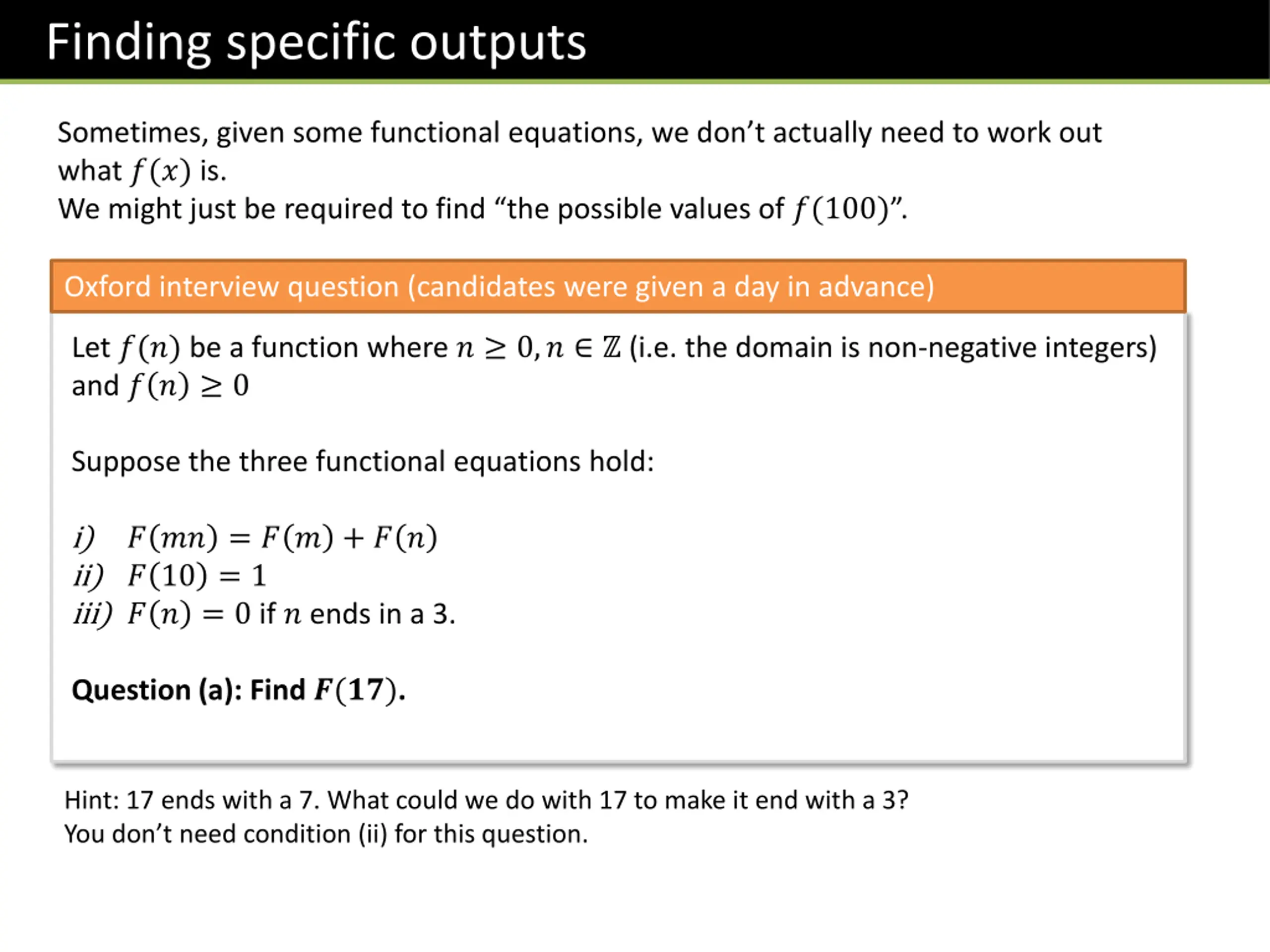 Finding specific outputs Sometimes, given some functional equations, we don t actually need to work out what ?(?) is. We might just be required to find the possible values of ?(100) . Oxford interview question (candidates were given a day in advance) Let ?(?) be a function where ? 0,? (i.e. the domain is non-negative integers) and ? ? 0 Suppose the three functional equations hold: i) ii) ? 10 = 1 iii) ? ? = 0 if ? ends in a 3. ? ?? = ? ? + ? ? Question (a): Find ?(??). Hint: 17 ends with a 7. What could we do with 17 to make it end with a 3? You don t need condition (ii) for this question.