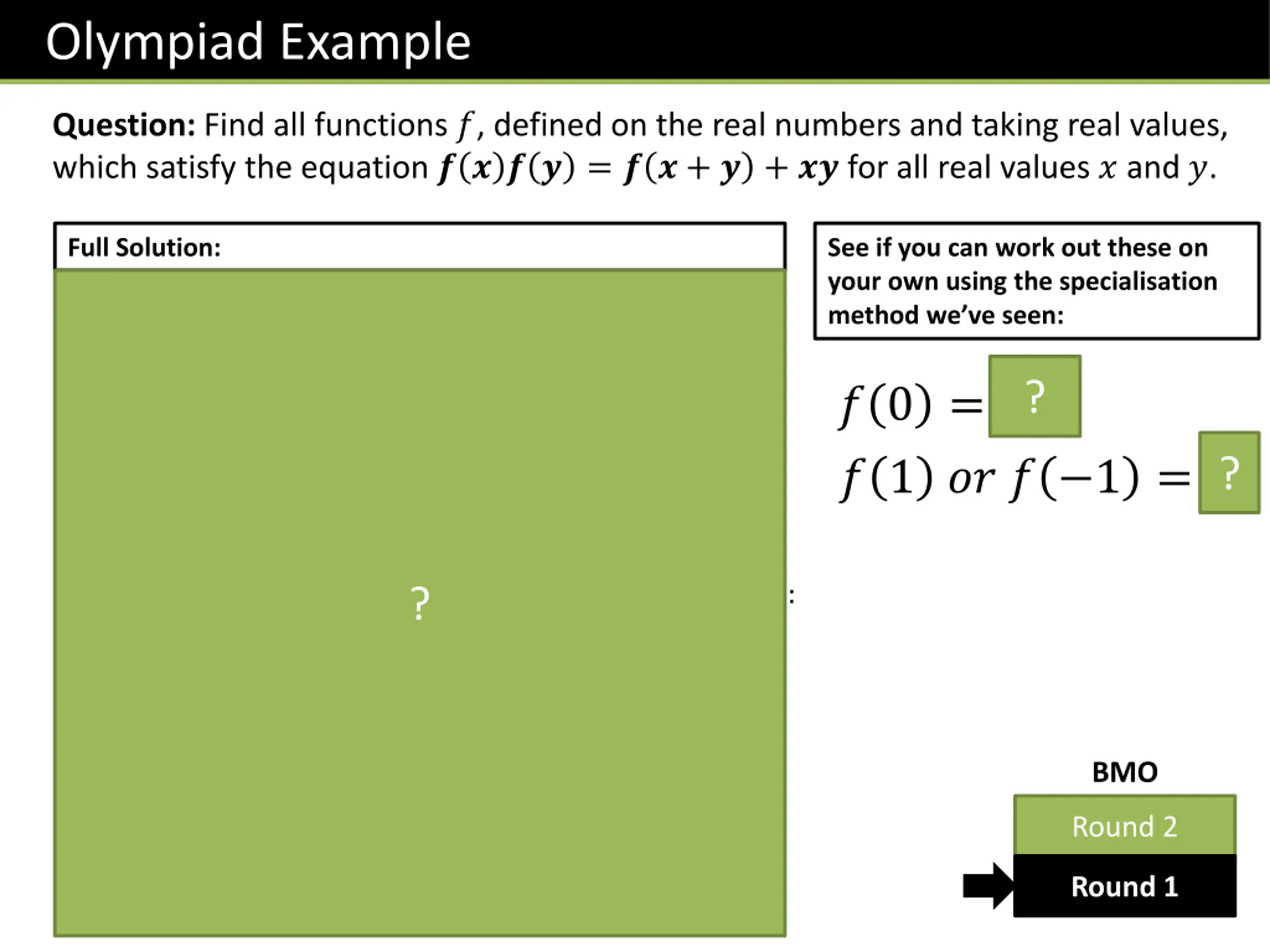 Olympiad Example Question: Find all functions ?, defined on the real numbers and taking real values, which satisfy the equation ? ? ? ? = ? ? + ? + ??for all real values ? and ?. Full Solution: See if you can work out these on your own using the specialisation method we ve seen: Using ? = 0, ? ? ? 0 = ?(?), thus ? 0 = 1. We can use ? = ? so that ? ? + ? = ? 0 = 1. This gives us ? ? ? ? = 1 ?2 Now if ? = 1, then ? 1 ? 1 = 0 Thus ? 1 = 0 or ? 1 = 0 ? ? 0 = 1 ? 1 ?? ? 1 = 0 ? Case 1: ? 1 = 0. Then letting ? = 1 so that we get rid of the ? ? : 0 = ? ? + 1 + ? ? ? + 1 = ? Which is equivalent to ? ? = ? 1 = 1 ? ? BMO Case 2: ? 1 = 0. Then letting ? = 1 for the same reason: 0 = ? ? 1 ? ? ? 1 = ? ? ? = ? + 1 Round 2 Round 1
