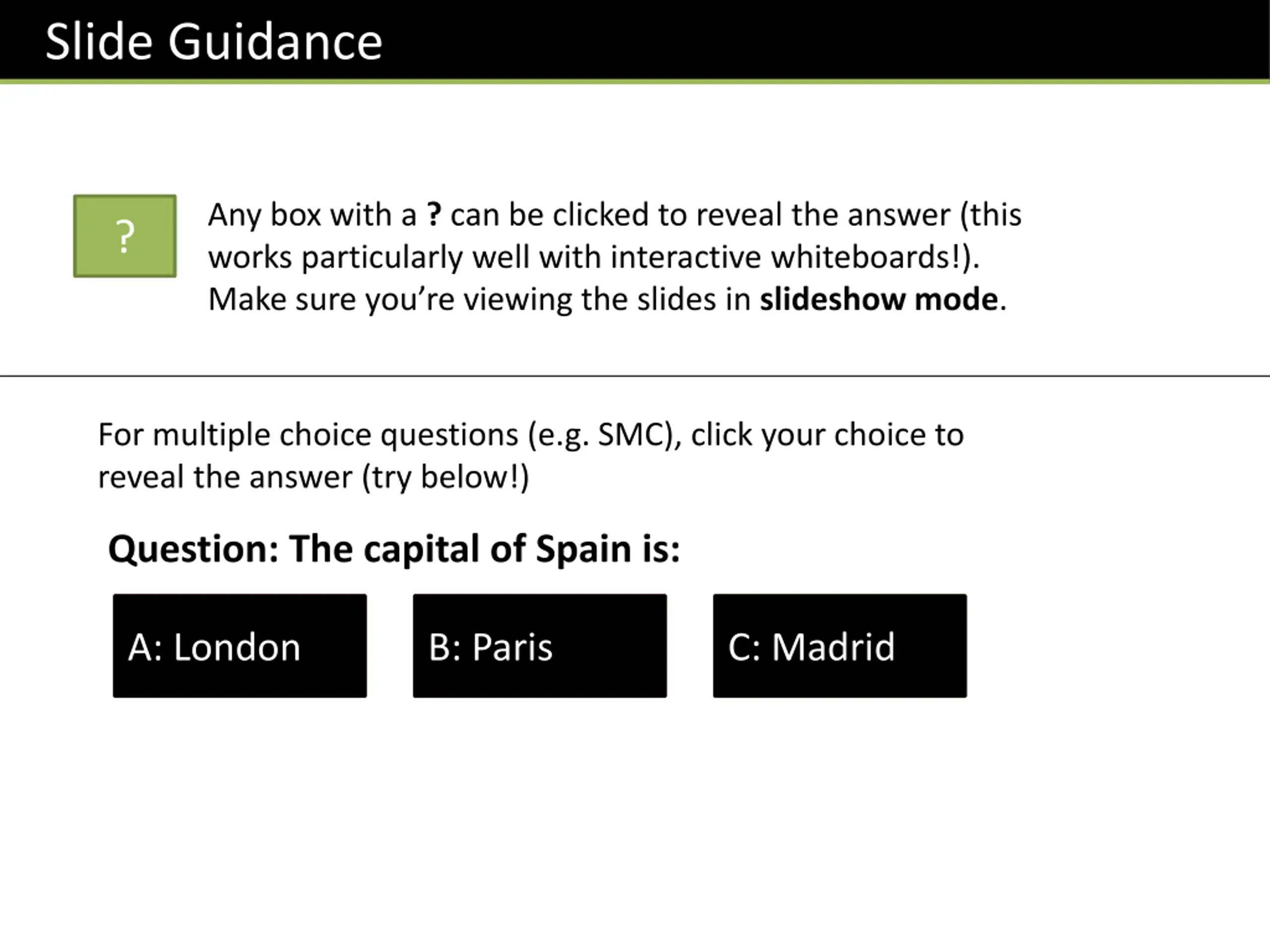 Slide Guidance Any box with a ? can be clicked to reveal the answer (this works particularly well with interactive whiteboards!). Make sure you re viewing the slides in slideshow mode. ? For multiple choice questions (e.g. SMC), click your choice to reveal the answer (try below!) Question: The capital of Spain is: A: London B: Paris C: Madrid