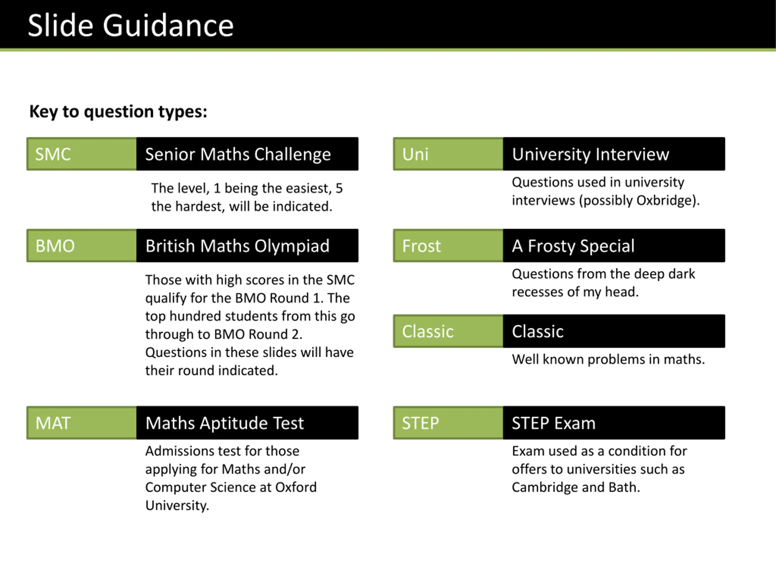 Slide Guidance Key to question types: SMC Senior Maths Challenge Uni University Interview Questions used in university interviews (possibly Oxbridge). The level, 1 being the easiest, 5 the hardest, will be indicated. BMO British Maths Olympiad Frost A Frosty Special Questions from the deep dark recesses of my head. Those with high scores in the SMC qualify for the BMO Round 1. The top hundred students from this go through to BMO Round 2. Questions in these slides will have their round indicated. Classic Classic Well known problems in maths. MAT Maths Aptitude Test STEP STEP Exam Admissions test for those applying for Maths and/or Computer Science at Oxford University. Exam used as a condition for offers to universities such as Cambridge and Bath.