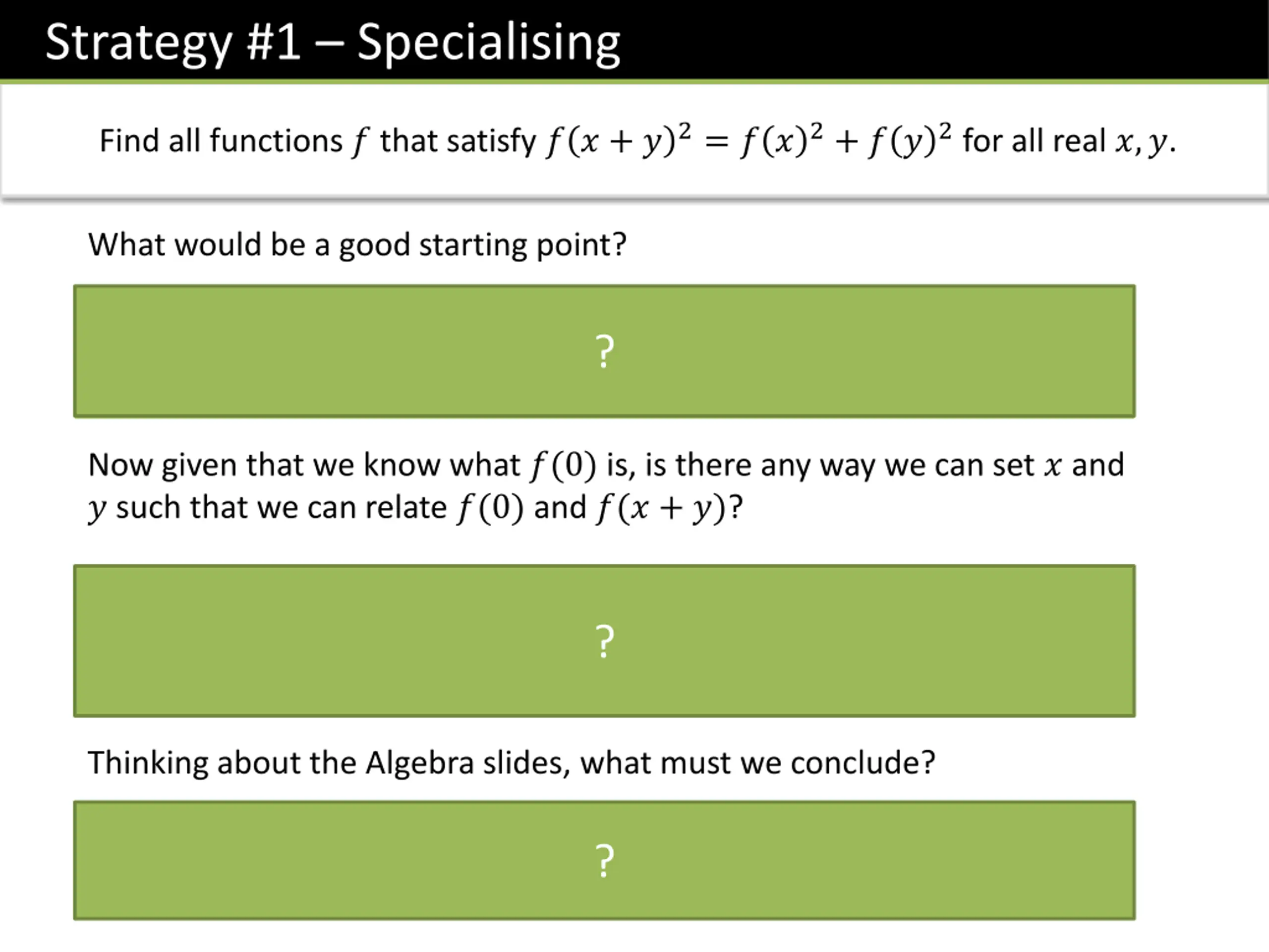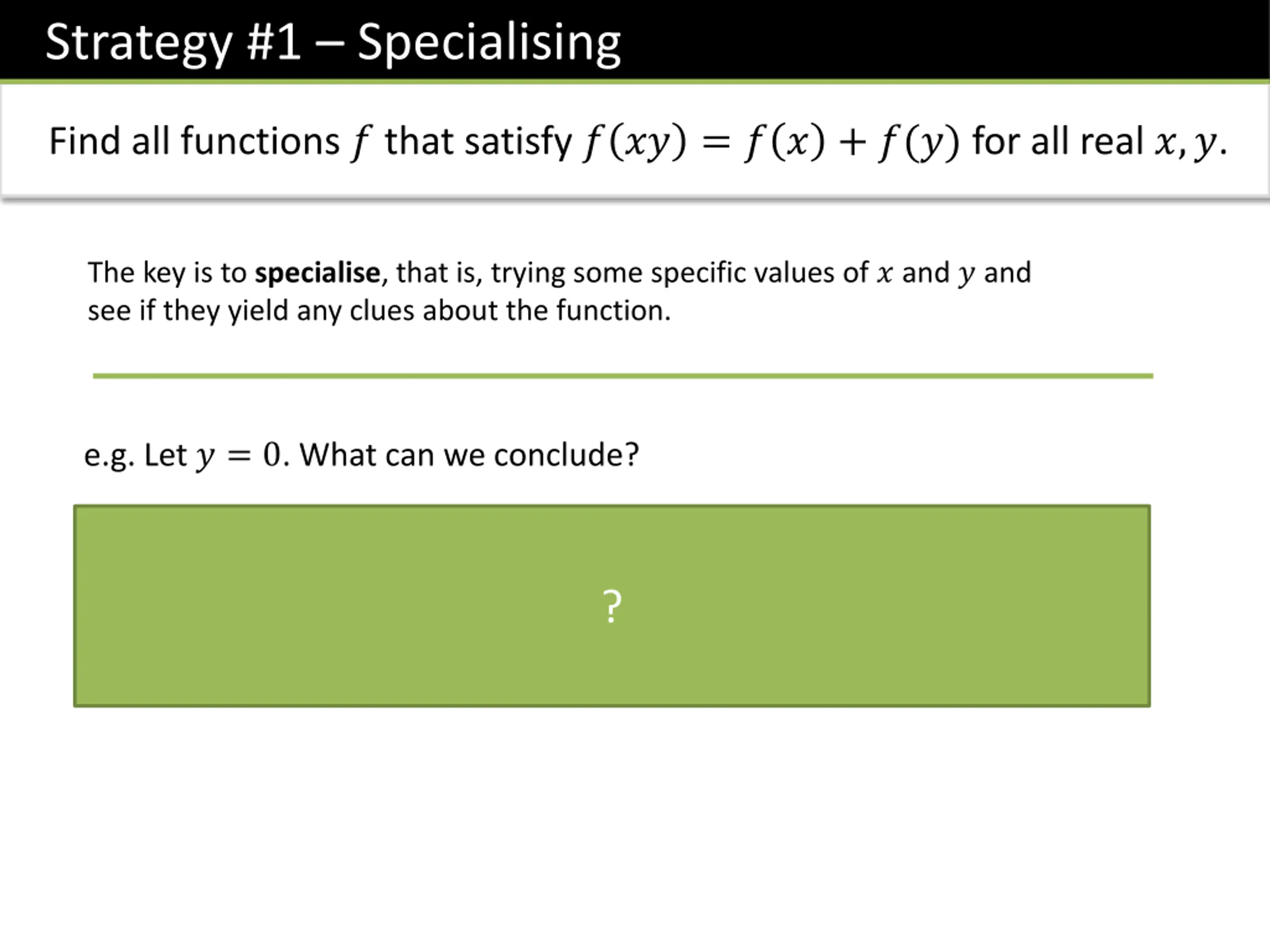 Strategy #1 Specialising Find all functions ? that satisfy ? ?? = ? ? + ?(?) for all real ?,?. The key is to specialise, that is, trying some specific values of ? and ? and see if they yield any clues about the function. e.g. Let ? = 0. What can we conclude? Then: ? 0 = ? ? + ?(0) ? ? = ? 0 ? 0 = 0 ? Thus ? ? = 0 for all values of ?.