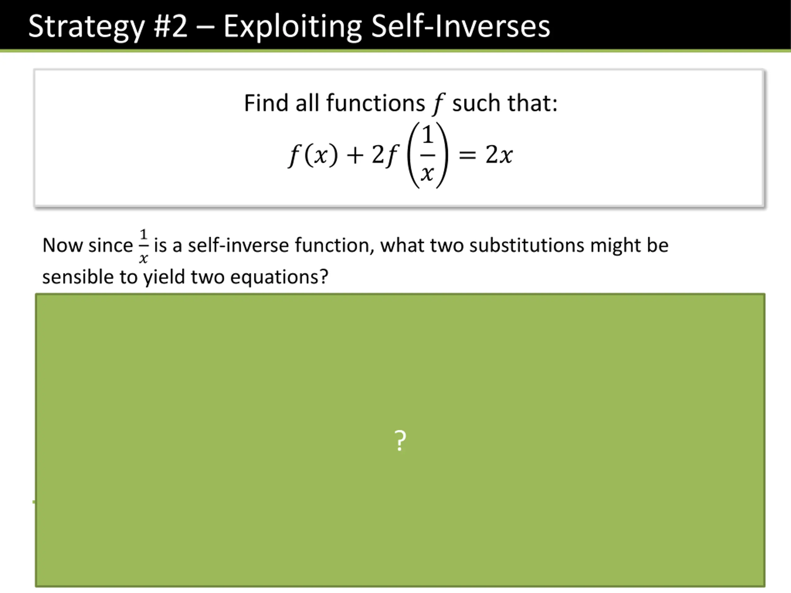 Strategy #2 Exploiting Self-Inverses Find all functions ? such that: 1 ? ? ? + 2? = 2? Now since 1 sensible to yield two equations? ? is a self-inverse function, what two substitutions might be Letting ? = ?: 1 ? ? ? + 2? = 2? Letting ? =? ?: + 2? ? =2 ? 1 ? ? ? ? ? =4 2?2 We now have simultaneous equations. We could eliminate ? ? by appropriate elimination. This gives us our solution: 3?? 1