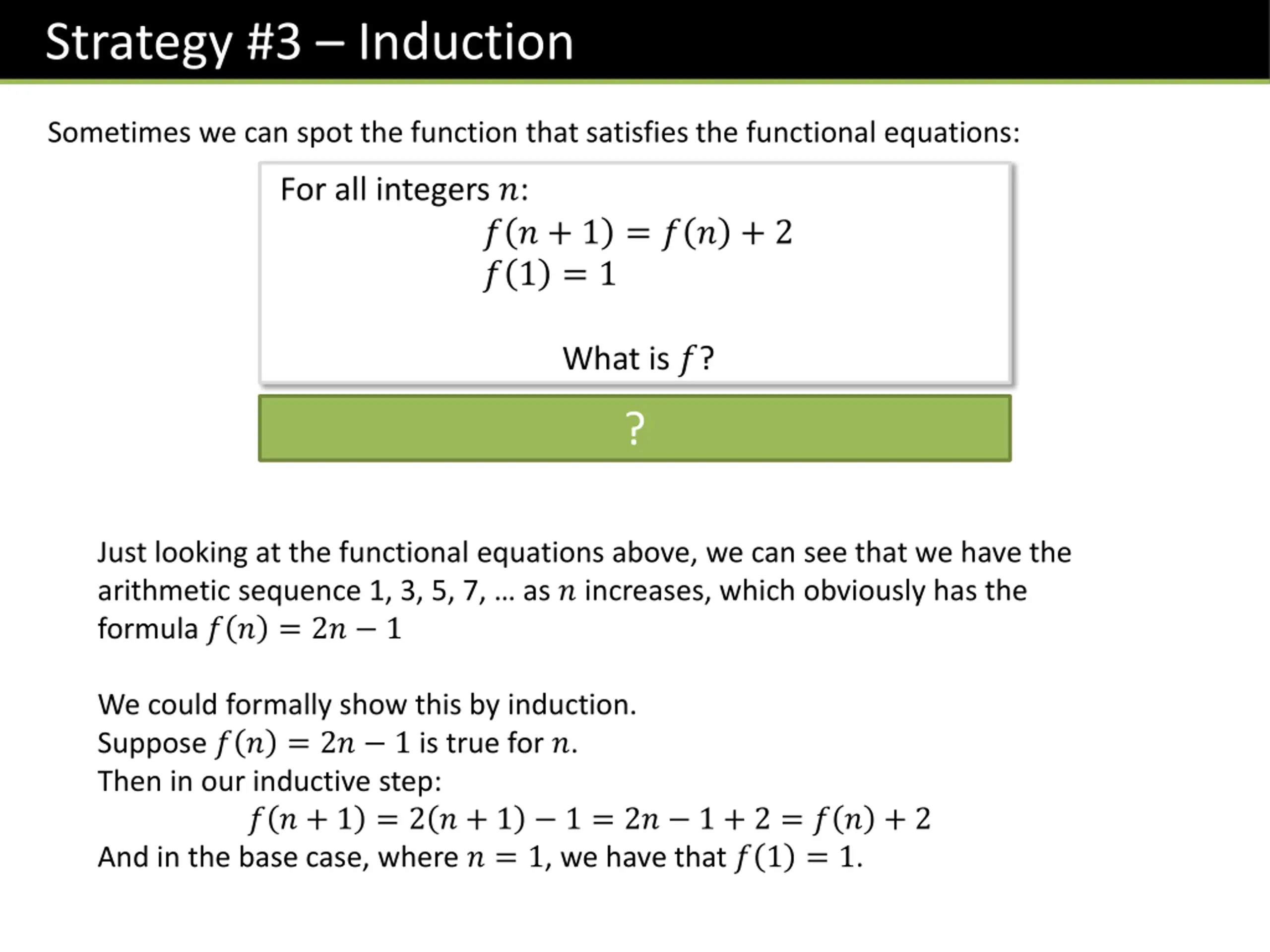 Strategy #3 Induction Sometimes we can spot the function that satisfies the functional equations: For all integers ?: ? ? + 1 = ? ? + 2 ? 1 = 1 What is ?? ? ? = ?? ? ? Just looking at the functional equations above, we can see that we have the arithmetic sequence 1, 3, 5, 7, as ? increases, which obviously has the formula ? ? = 2? 1 We could formally show this by induction. Suppose ? ? = 2? 1 is true for ?. Then in our inductive step: ? ? + 1 = 2 ? + 1 1 = 2? 1 + 2 = ? ? + 2 And in the base case, where ? = 1, we have that ? 1 = 1.