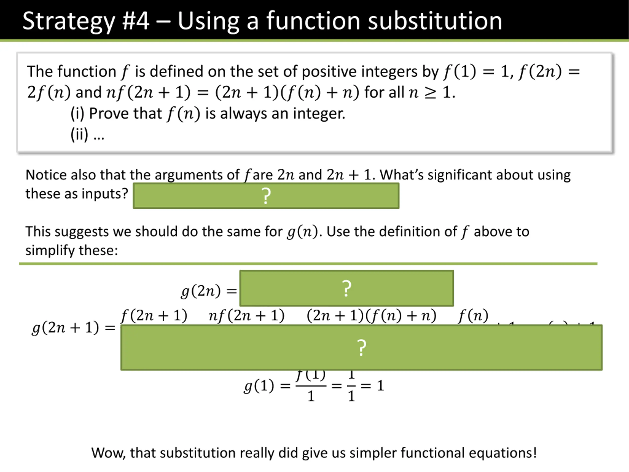 Strategy #4 Using a function substitution The function ? is defined on the set of positive integers by ? 1 = 1, ? 2? = 2? ? and ?? 2? + 1 = 2? + 1 ? ? + ? for all ? 1. (i) Prove that ?(?) is always an integer. (ii) Notice also that the arguments of ?are 2? and 2? + 1. What s significant about using these as inputs? They represent even and odd integers. ? This suggests we should do the same for ? ? . Use the definition of ? above to simplify these: ? 2? =? 2? =2? ? =? ? ? = ? ? 2? 2? 2? + 1 ? ? + ? ? 2? + 1 ? ? ? 2? + 1 =? 2? + 1 =?? 2? + 1 ? 2? + 1 =? ? = + 1 = ? ? + 1 2? + 1 ? ? 1 =? 1 =1 1= 1 1 Wow, that substitution really did give us simpler functional equations!