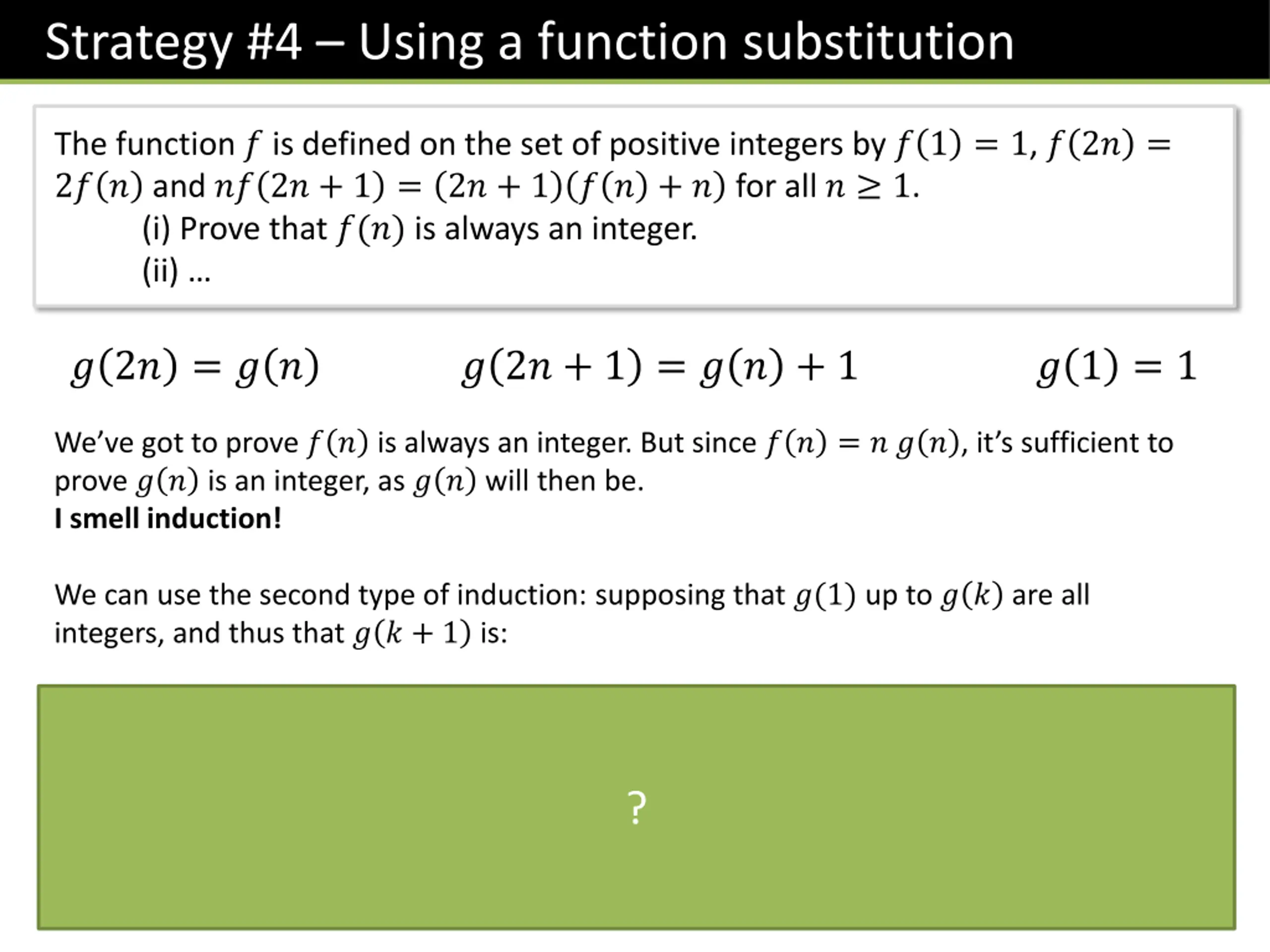 Strategy #4 Using a function substitution The function ? is defined on the set of positive integers by ? 1 = 1, ? 2? = 2? ? and ?? 2? + 1 = 2? + 1 ? ? + ? for all ? 1. (i) Prove that ?(?) is always an integer. (ii) ? 2? = ? ? ? 2? + 1 = ? ? + 1 ? 1 = 1 We ve got to prove ? ? is always an integer. But since ? ? = ? ? ? , it s sufficient to prove ? ? is an integer, as ? ? will then be. I smell induction! We can use the second type of induction: supposing that ?(1) up to ? ? are all integers, and thus that ? ? + 1 is: Base case: ? 1 = 1, and 1 is an integer. Inductive case: Suppose ?(1) to ?(?) are integers. Then if ? + 1 is even, ? + 1 = 2?. Now ? 2? = ?(?), and ? ?, so by induction, ?(?) is an integer. Thus ? ? + 1 is an integer. If ? + 1 is odd, then ? + 1 = 2? + 1. Now ? 2? + 1 = ? ? + 1. Again, ? ? so ?(?) is an integer, and clearly ? ? + 1 then is. ?