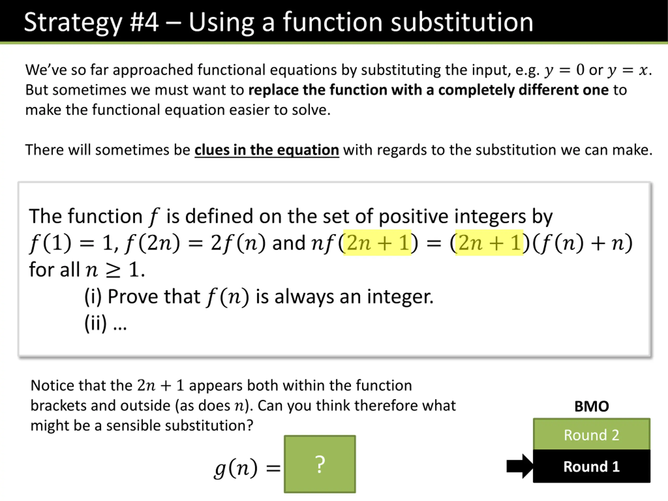 Strategy #4 Using a function substitution We ve so far approached functional equations by substituting the input, e.g. ? = 0 or ? = ?. But sometimes we must want to replace the function with a completely different one to make the functional equation easier to solve. There will sometimes be clues in the equation with regards to the substitution we can make. The function ? is defined on the set of positive integers by ? 1 = 1, ? 2? = 2? ? and ?? 2? + 1 = 2? + 1 ? ? + ? for all ? 1. (i) Prove that ?(?) is always an integer. (ii) Notice that the 2? + 1 appears both within the function brackets and outside (as does ?). Can you think therefore what might be a sensible substitution? ? ? =? ? BMO Round 2 ?? Round 1