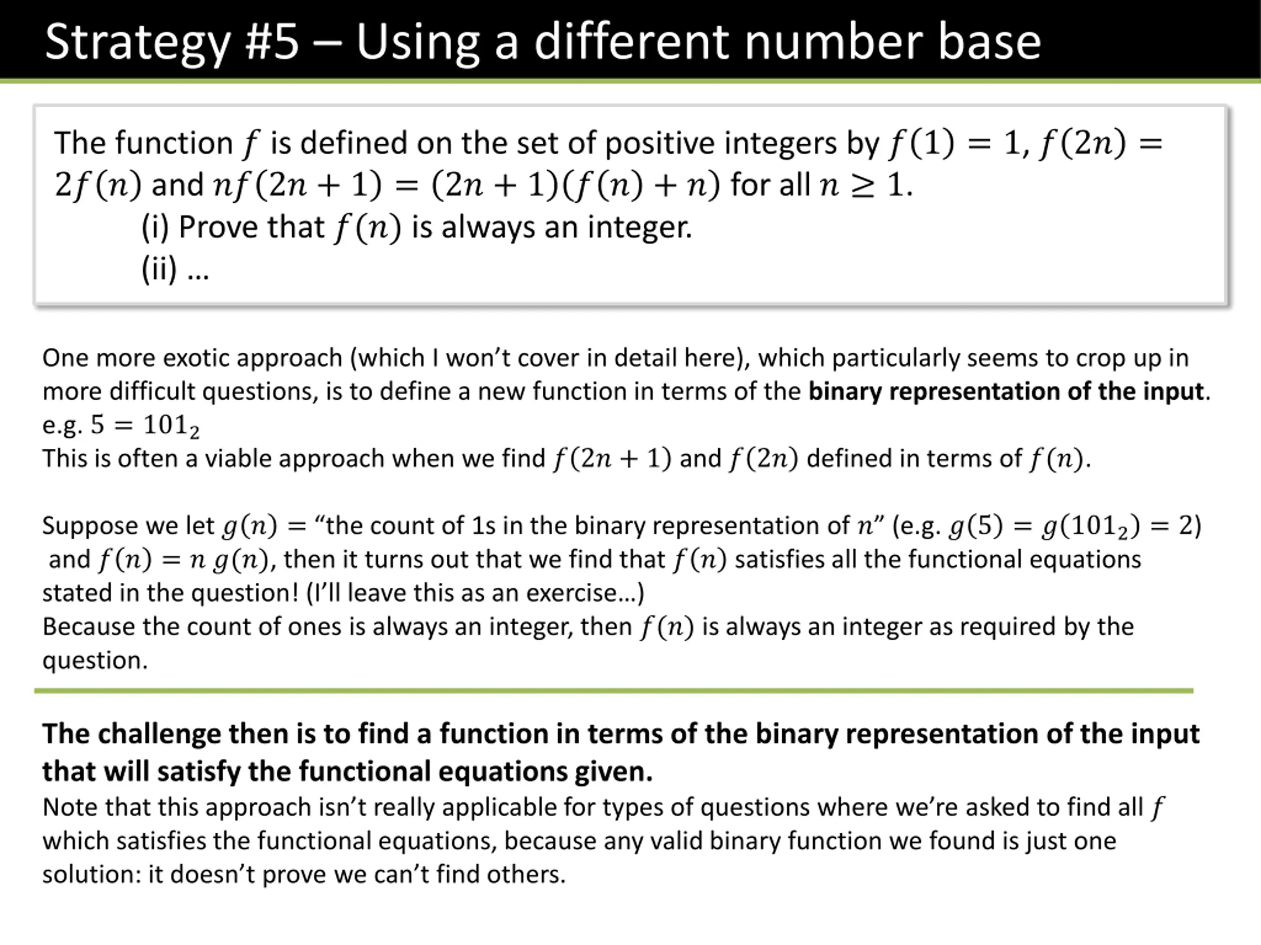 Strategy #5 Using a different number base The function ? is defined on the set of positive integers by ? 1 = 1, ? 2? = 2? ? and ?? 2? + 1 = 2? + 1 ? ? + ? for all ? 1. (i) Prove that ?(?) is always an integer. (ii) One more exotic approach (which I won t cover in detail here), which particularly seems to crop up in more difficult questions, is to define a new function in terms of the binary representation of the input. e.g. 5 = 1012 This is often a viable approach when we find ? 2? + 1 and ? 2? defined in terms of ?(?). Suppose we let ? ? = the count of 1s in the binary representation of ? (e.g. ? 5 = ? 1012 = 2) and ? ? = ? ?(?), then it turns out that we find that ? ? satisfies all the functional equations stated in the question! (I ll leave this as an exercise ) Because the count of ones is always an integer, then ?(?) is always an integer as required by the question. The challenge then is to find a function in terms of the binary representation of the input that will satisfy the functional equations given. Note that this approach isn t really applicable for types of questions where we re asked to find all ? which satisfies the functional equations, because any valid binary function we found is just one solution: it doesn t prove we can t find others.