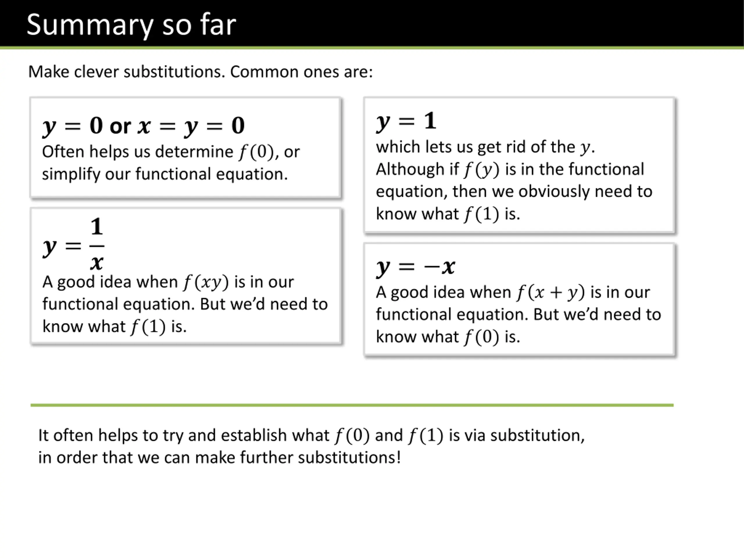 Summary so far Make clever substitutions. Common ones are: ? = ? which lets us get rid of the ?. Although if ?(?) is in the functional equation, then we obviously need to know what ?(1) is. ? = ?or ? = ? = ? Often helps us determine ?(0), or simplify our functional equation. ? =? ? ? = ? A good idea when ? ? + ? is in our functional equation. But we d need to know what ?(0) is. A good idea when ?(??) is in our functional equation. But we d need to know what ?(1) is. It often helps to try and establish what ?(0) and ?(1) is via substitution, in order that we can make further substitutions!