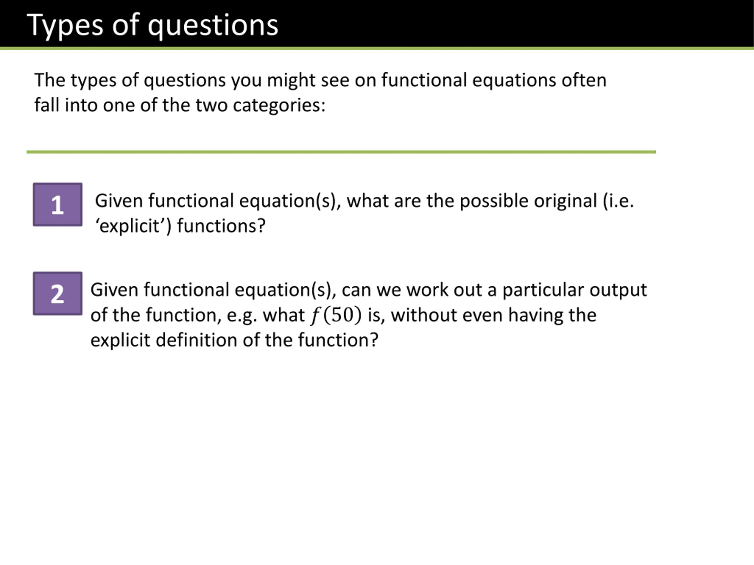 Types of questions The types of questions you might see on functional equations often fall into one of the two categories: Given functional equation(s), what are the possible original (i.e. explicit ) functions? 1 Given functional equation(s), can we work out a particular output of the function, e.g. what ? 50 is, without even having the explicit definition of the function? 2