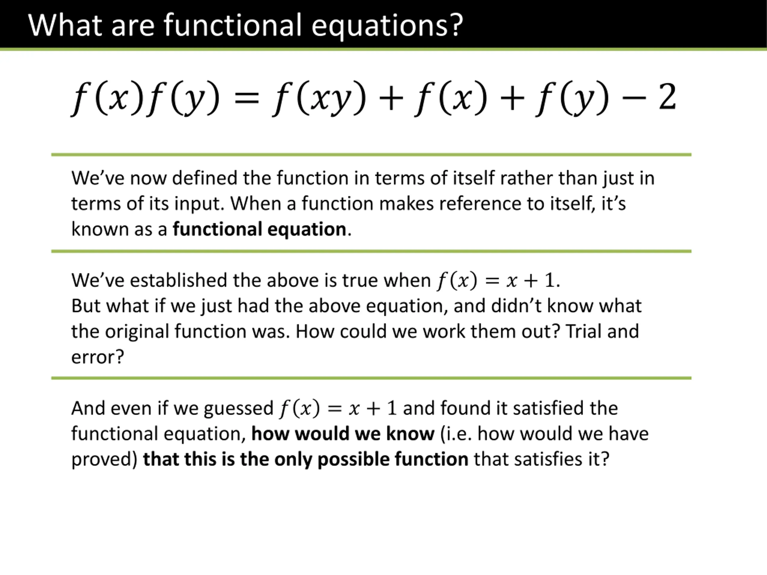 What are functional equations? ? ? ? ? = ? ?? + ? ? + ? ? 2 We ve now defined the function in terms of itself rather than just in terms of its input. When a function makes reference to itself, it s known as a functional equation. We ve established the above is true when ? ? = ? + 1. But what if we just had the above equation, and didn t know what the original function was. How could we work them out? Trial and error? And even if we guessed ? ? = ? + 1 and found it satisfied the functional equation, how would we know (i.e. how would we have proved) that this is the only possible function that satisfies it?