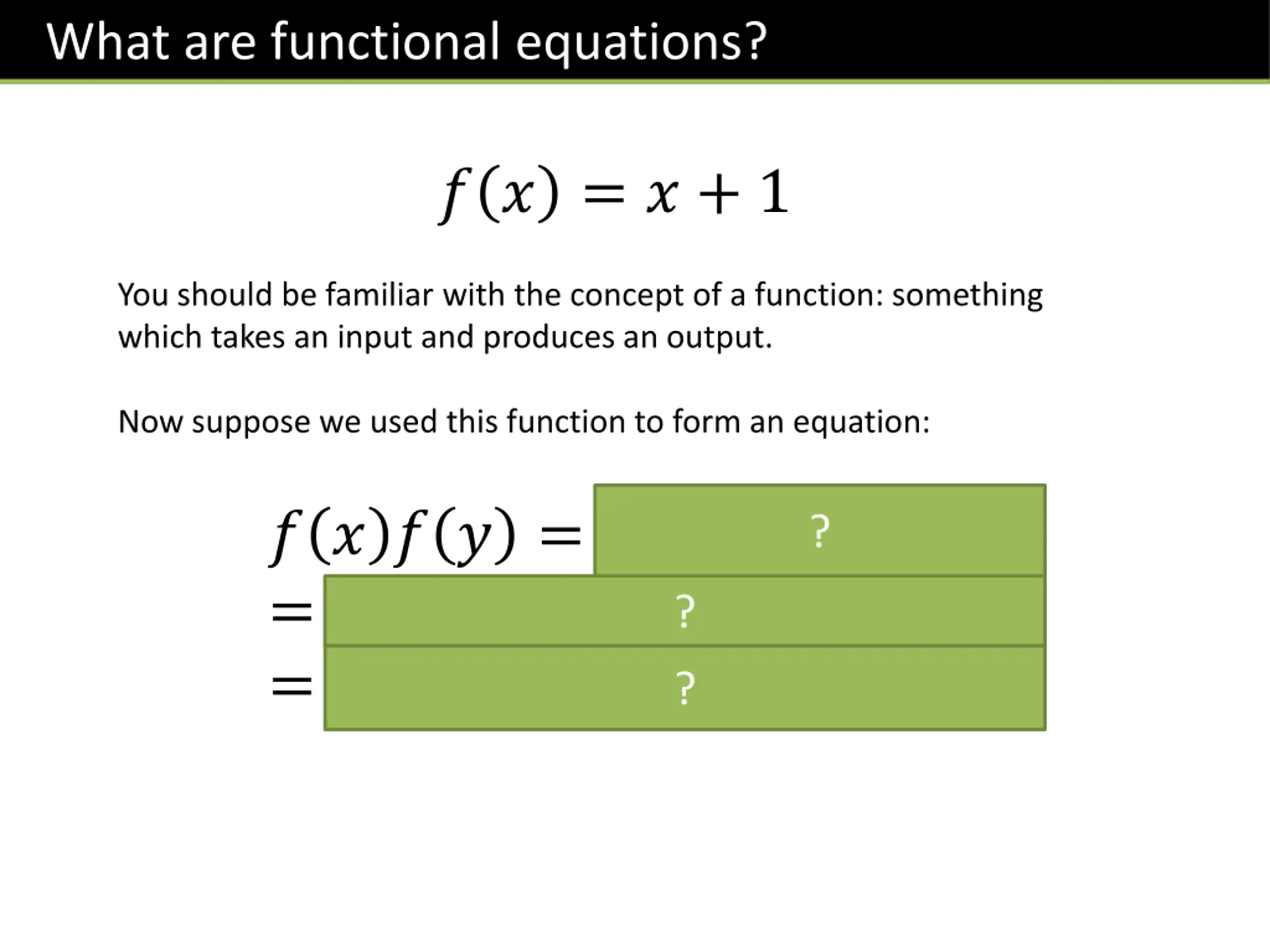 What are functional equations? ? ? = ? + 1 You should be familiar with the concept of a function: something which takes an input and produces an output. Now suppose we used this function to form an equation: ? ? ? ? = ? + 1 ? + 1 = ?? + ? + ? + 1 = ? ?? + ? ? + ? ? 2 ? ? ?