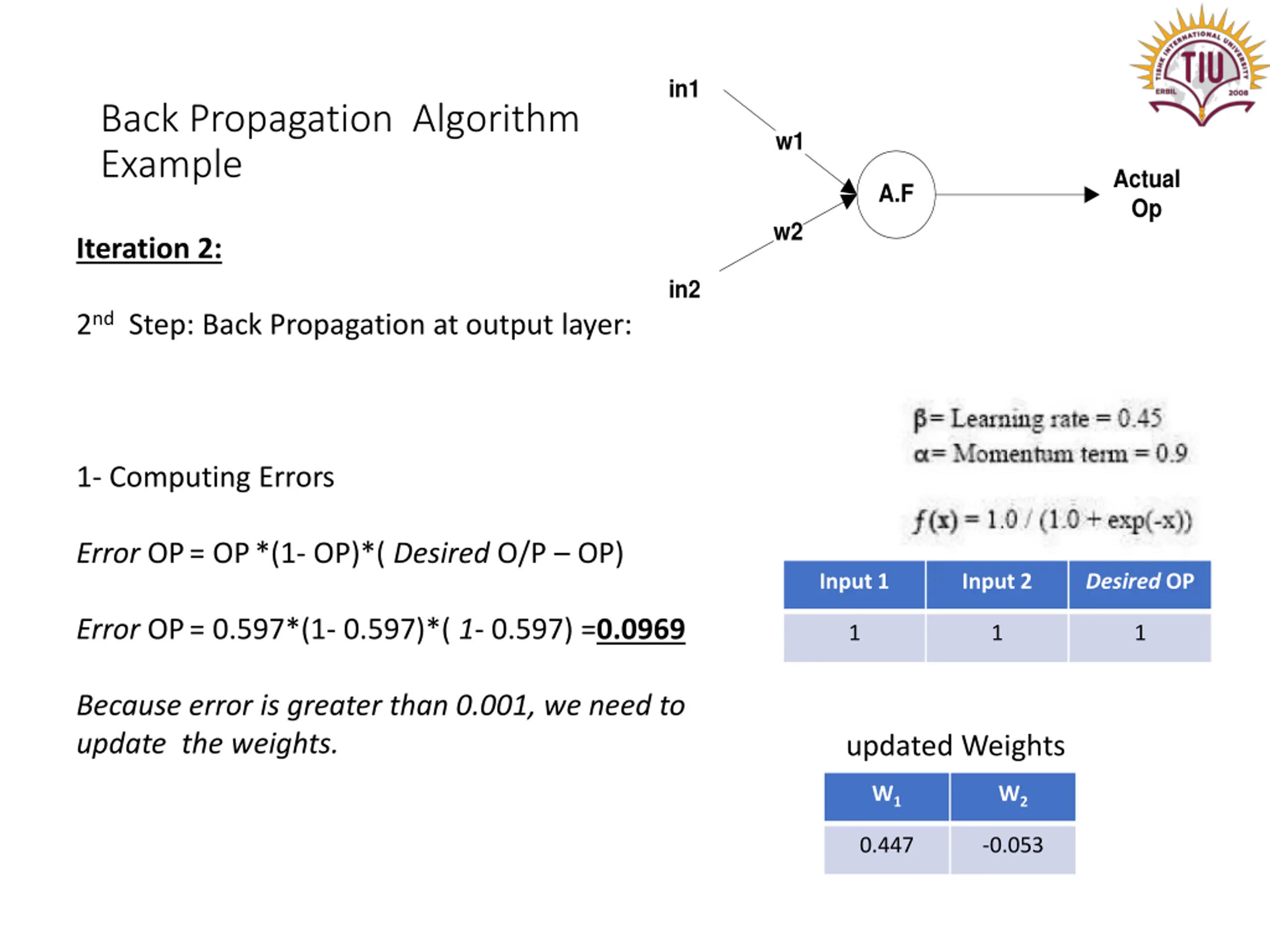 in1 Back Propagation Algorithm Example w1 Actual Op A.F w2 Iteration 2: in2 2nd Step: Back Propagation at output layer: 1- Computing Errors Error OP= OP*(1- OP)*( Desired O/P OP) Input 1 Input 2 Desired OP Error OP= 0.597*(1- 0.597)*( 1- 0.597) =0.0969 1 1 1 Because error is greater than 0.001, we need to update the weights. updated Weights W1 W2 0.447 -0.053